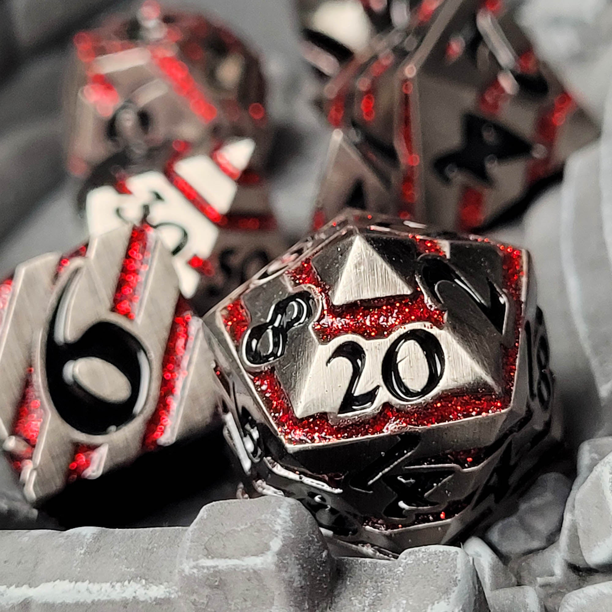 Banded Brushed Silver Red Metal RPG Dice Set of 7