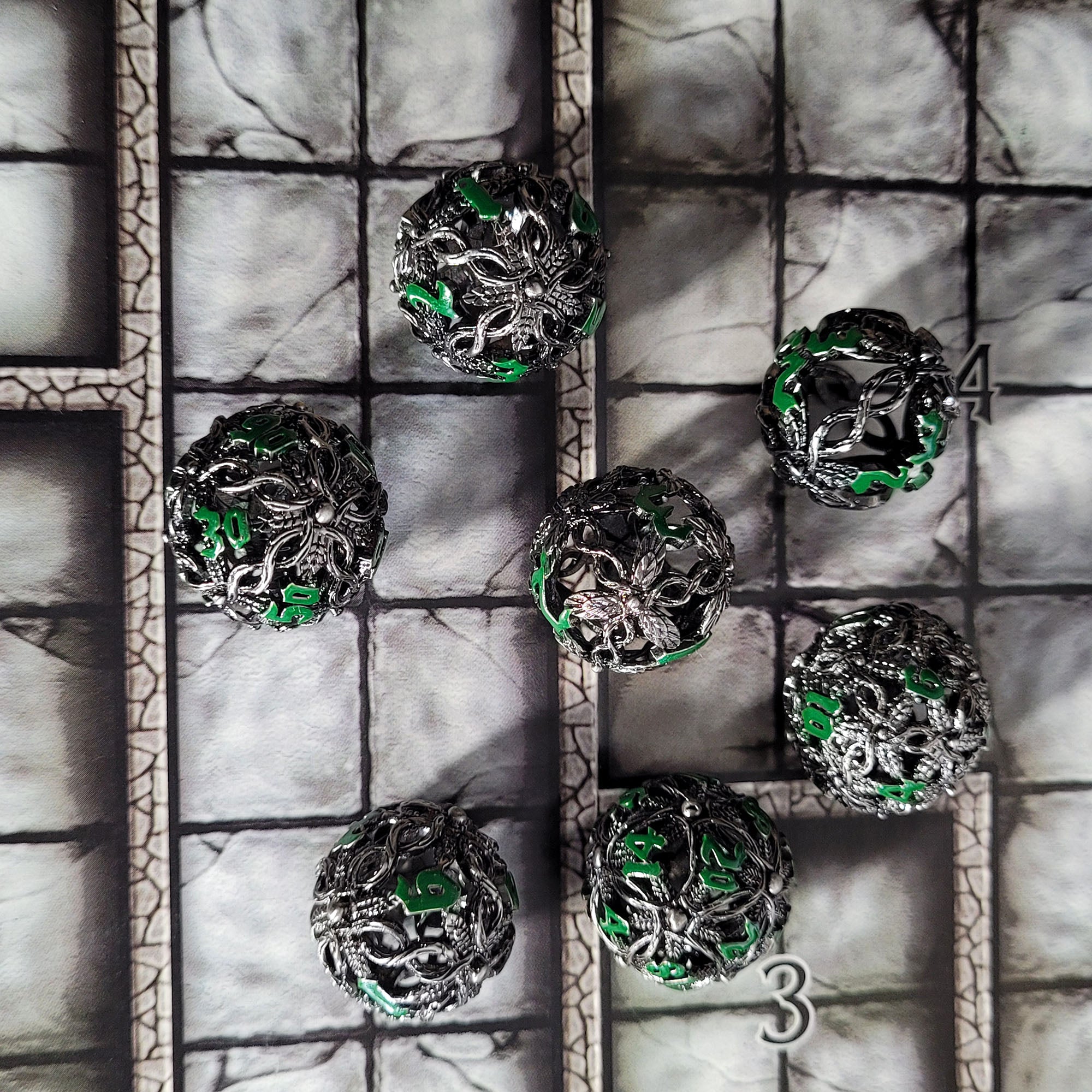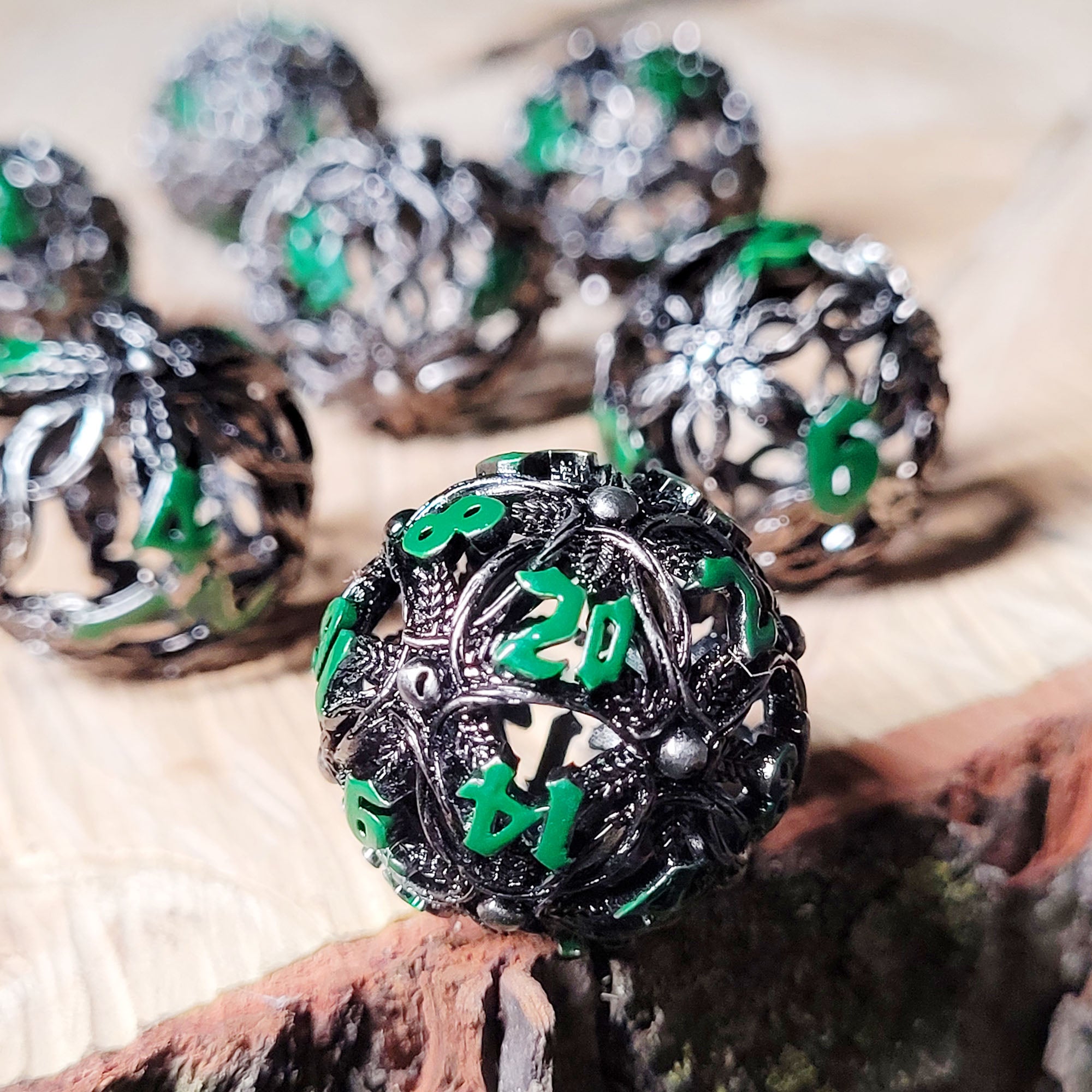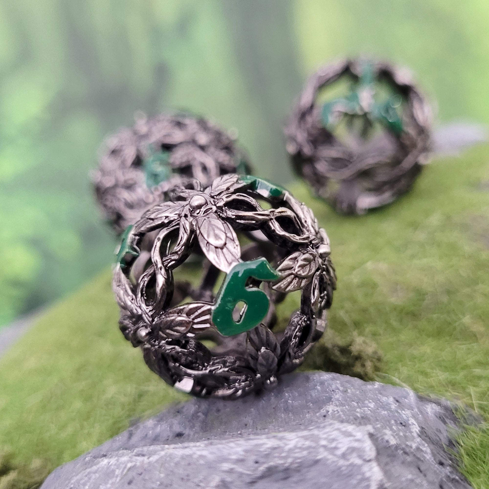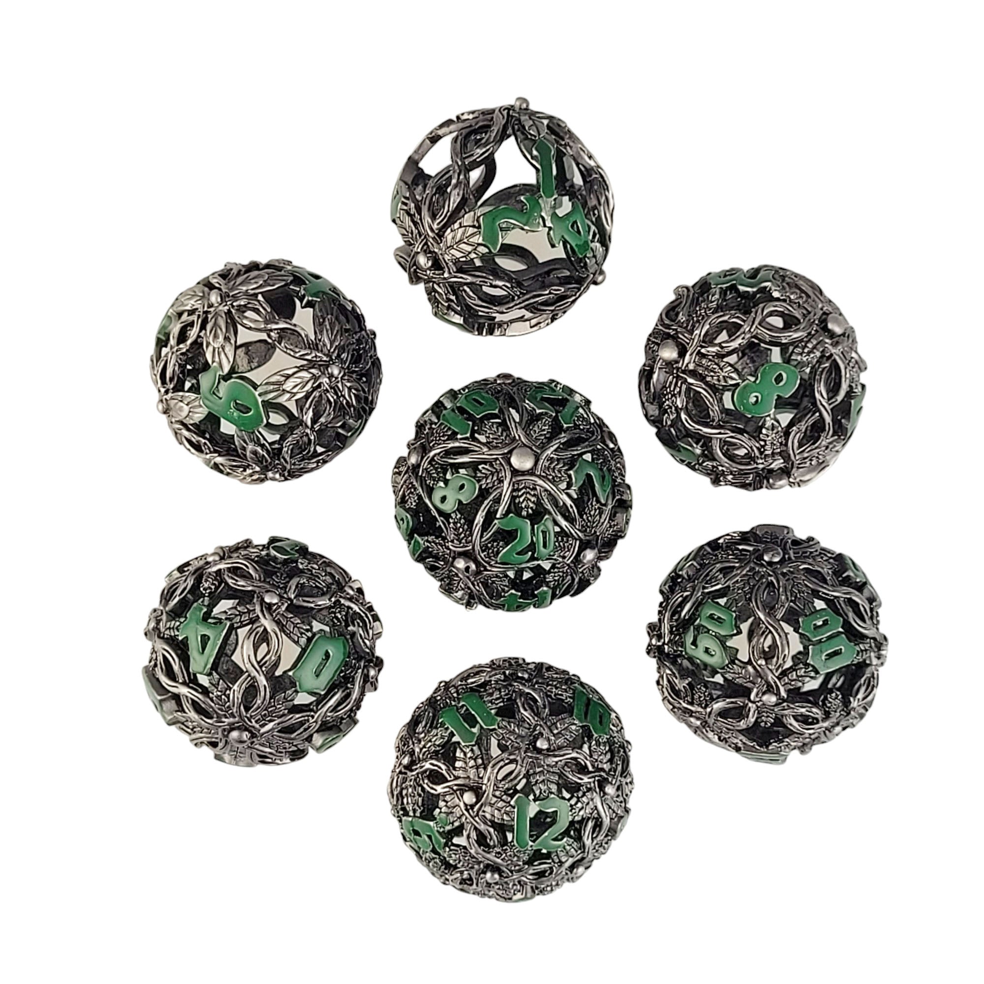 Sylvan Spheres Silver Green Hollow Metal RPG Dice Set