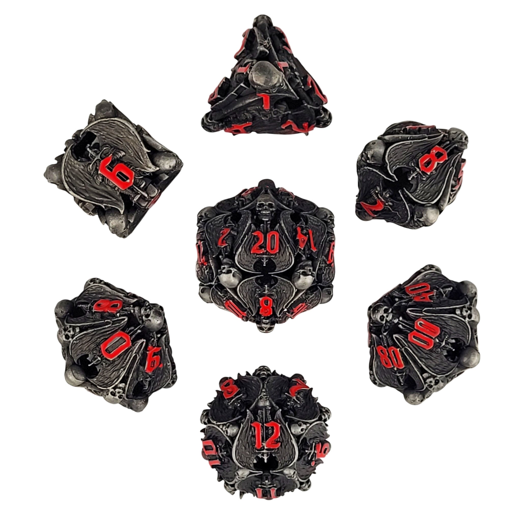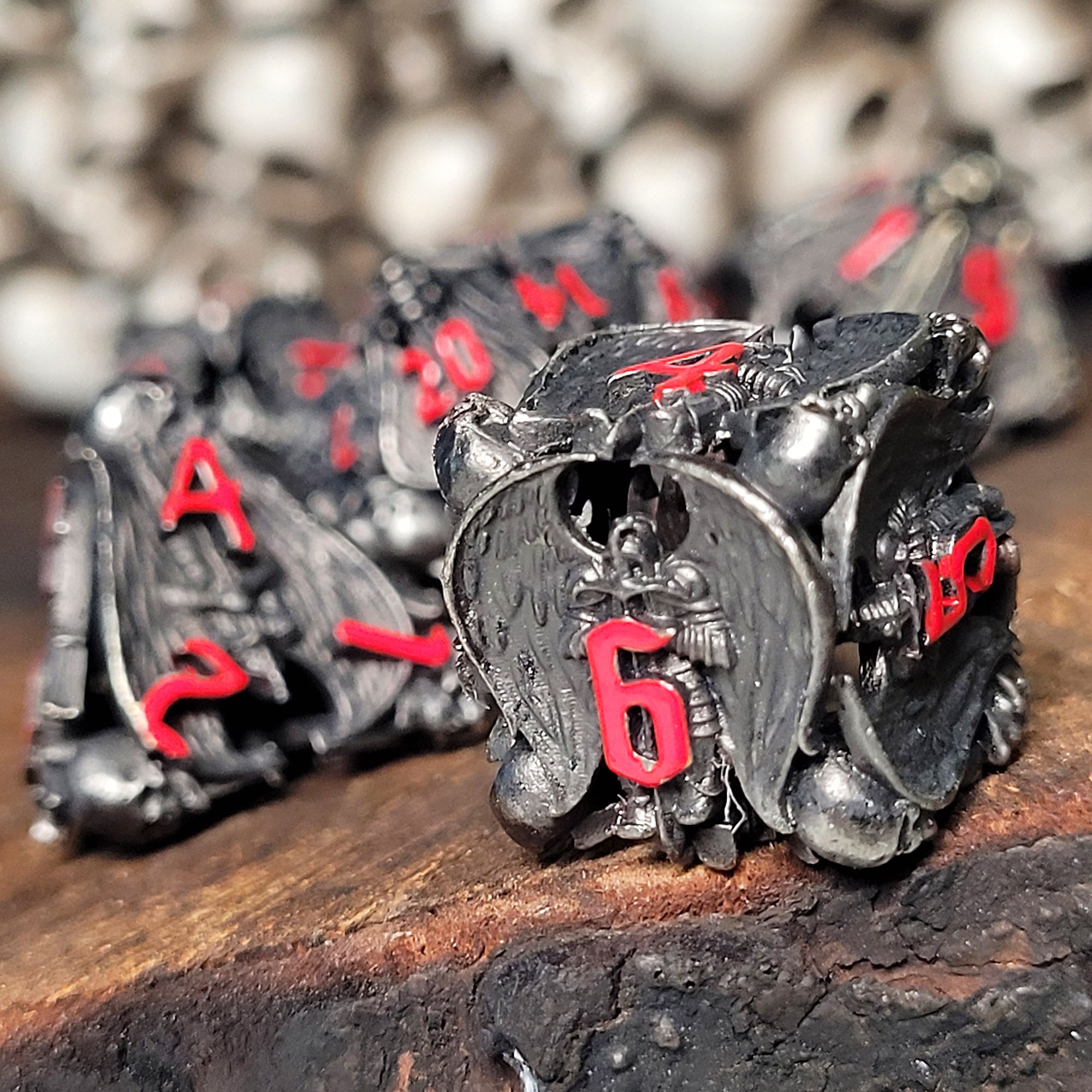 Winged Death Gunmetal Red Hollow Metal RPG Dice Set of 7