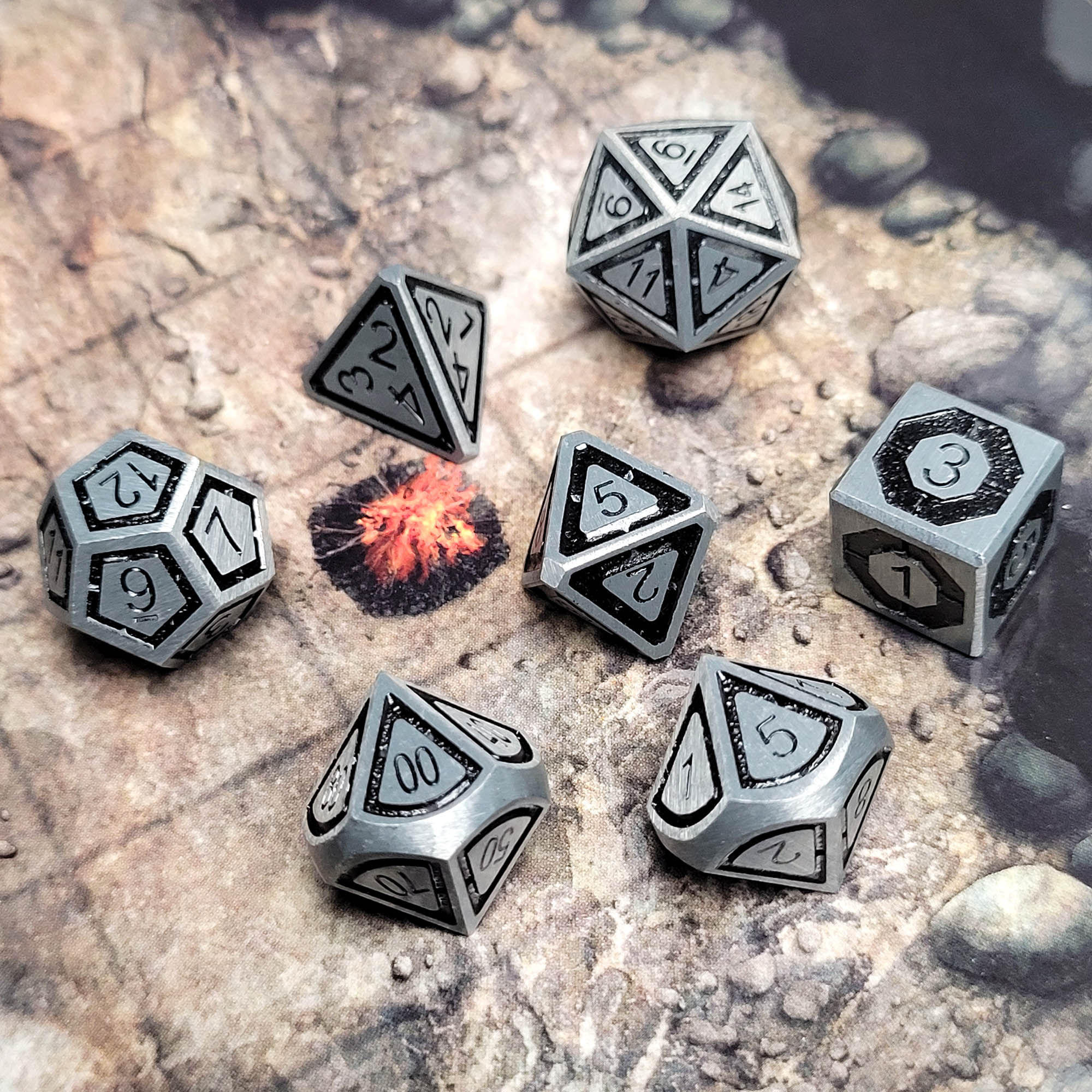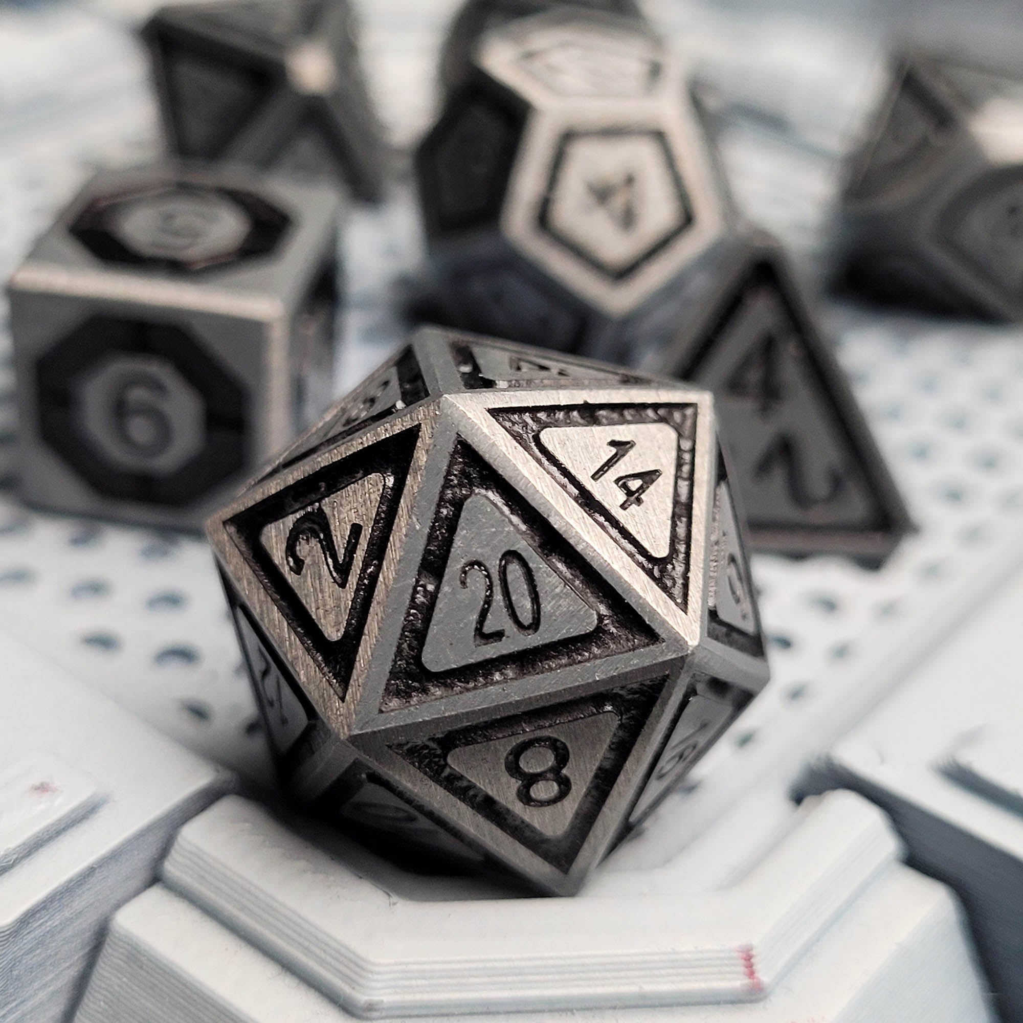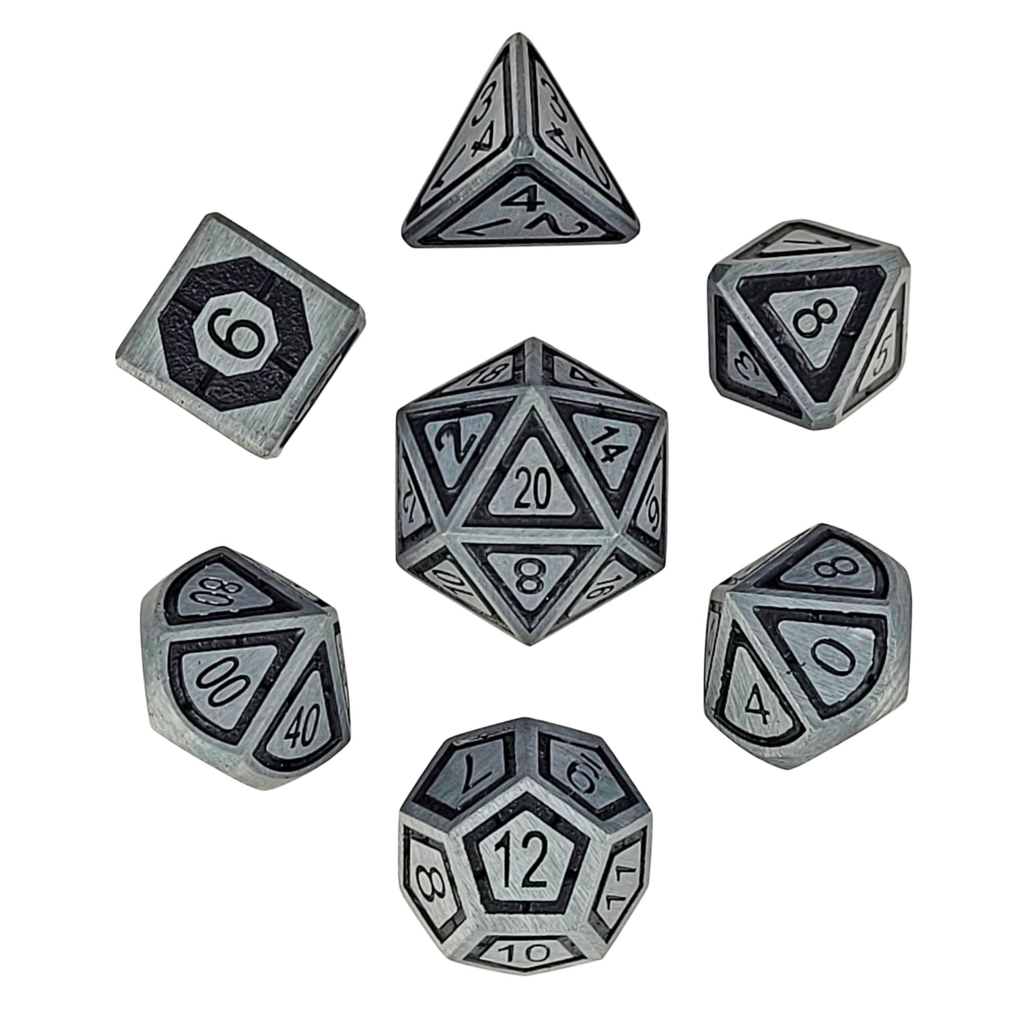 Celestial Artifact Brushed Silver Black Metal RPG Dice Set of 7
