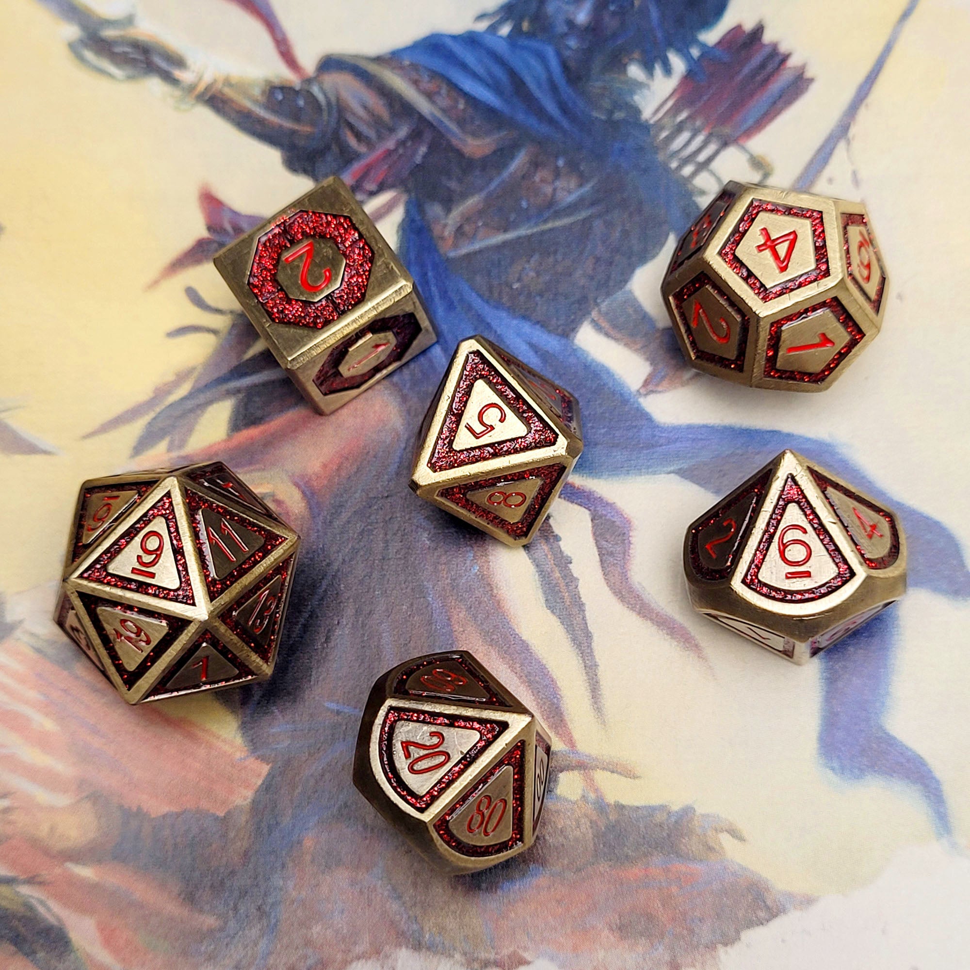 Celestial Artifact Antiqued Gold Red Glitter Metal RPG Dice Set of 7