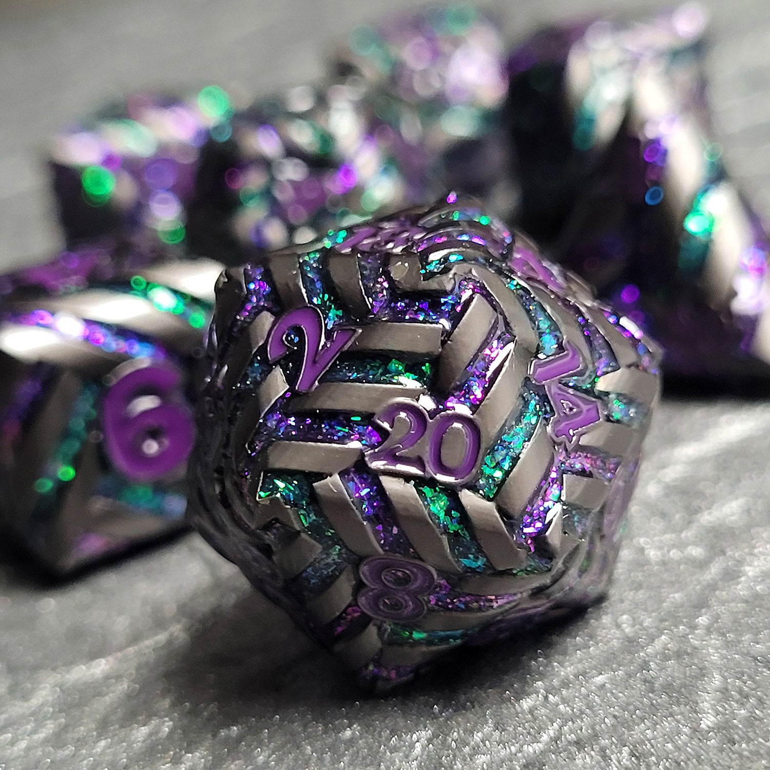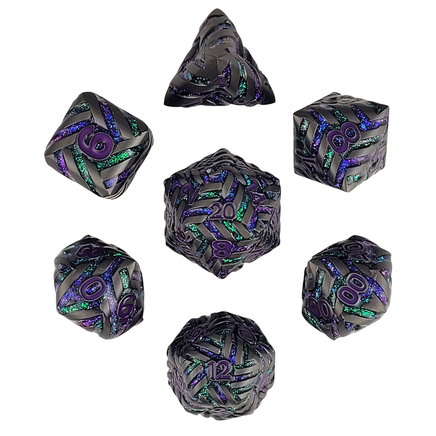 Cosmic Energy Matte Gunmetal Purple Green Metal RPG Dice Set of 7