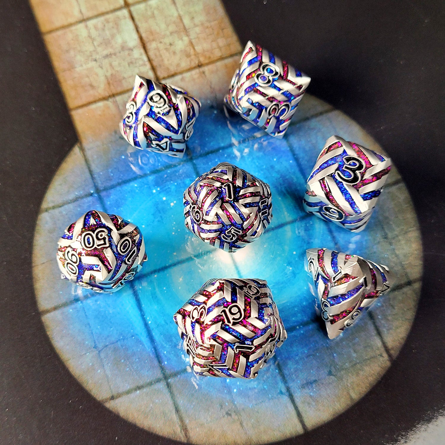 Cosmic Energy Brushed Steel Blue Red Metal RPG Dice Set of 7