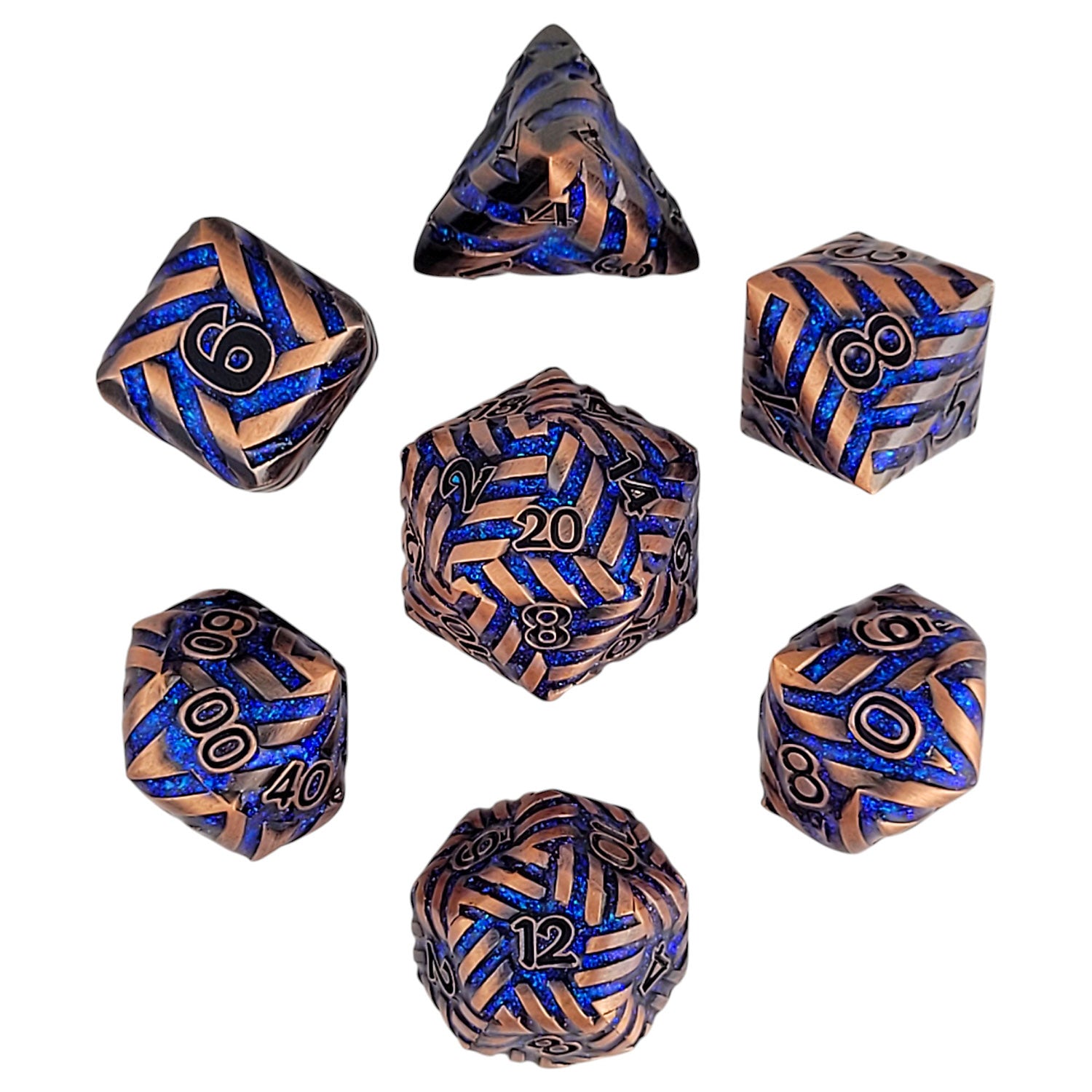 This solid metal RPG dice set features a detailed swirl pattern in a copper metal finish with Blue Sparkle Glitter channels.