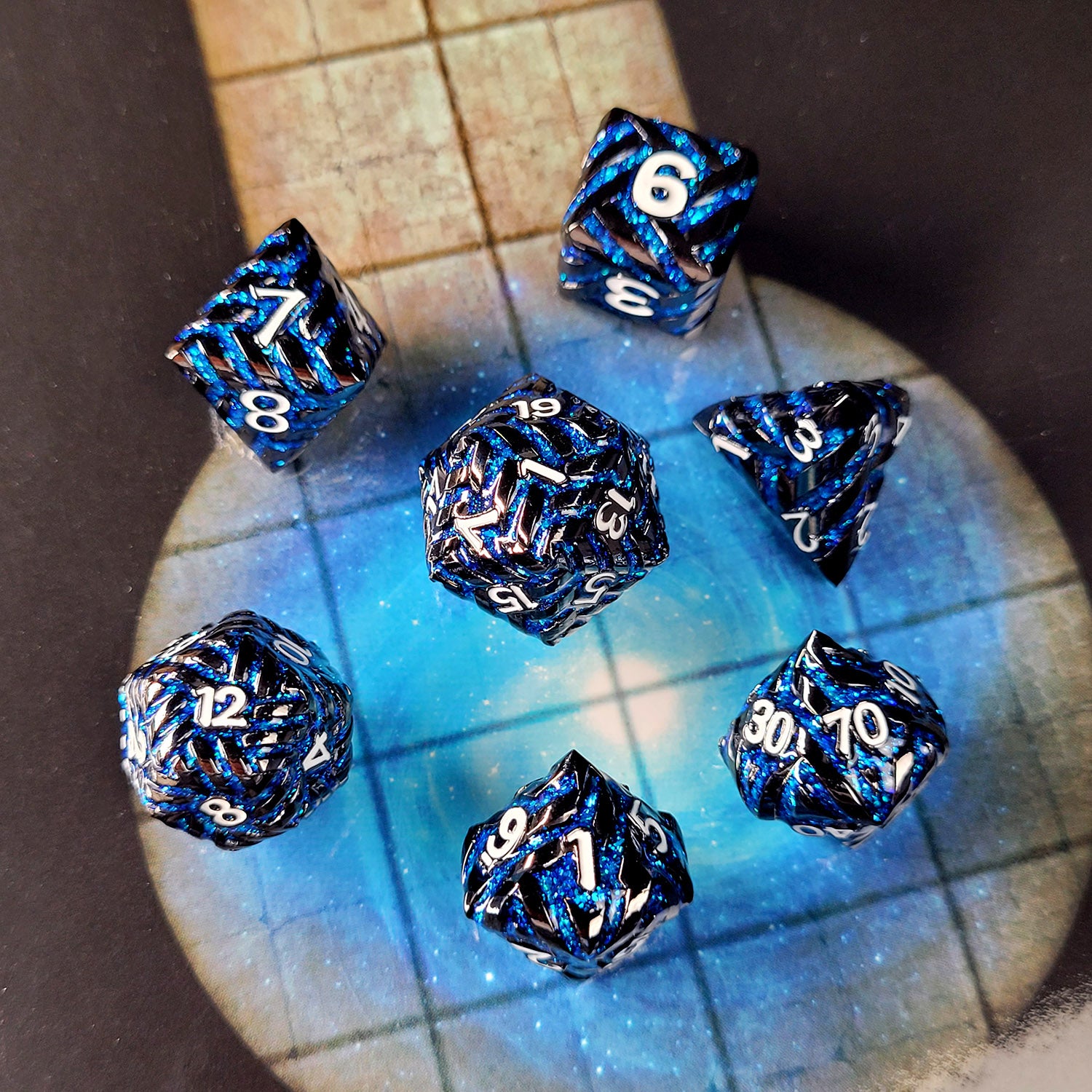 This solid metal RPG dice set features a detailed swirl pattern in a gun metal finish with Blue Sparkle Glitter channels.