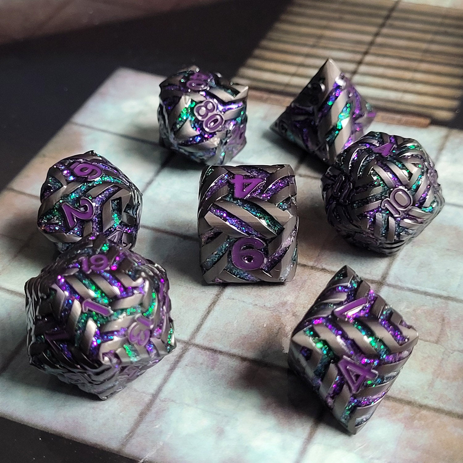 This solid metal RPG dice set features a detailed swirl pattern in a Gunmetal Matte finish with Purple-Green Sparkle Glitter channels.
