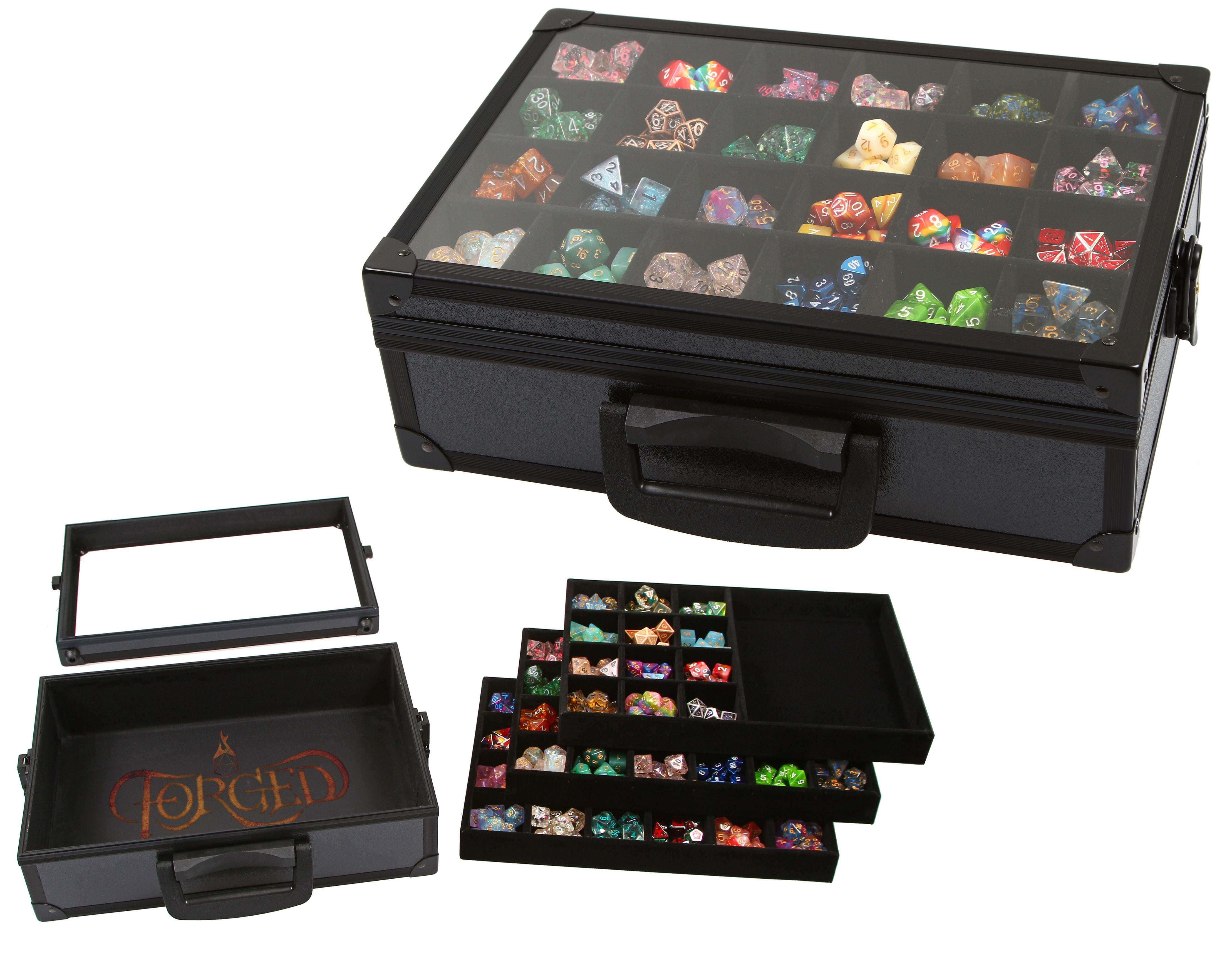 - VERSATILE: Multiple uses. Fill the removable dice trays with your favorite dice, close the lid and display your collection or open the case, move the dice trays to the lid and use the inside as a rolling dice tray. Bottom is lined with our Forged Dice Co logo. Can Also be Stood Upright To Display your Collection. Also comes with a handle to make travel easier