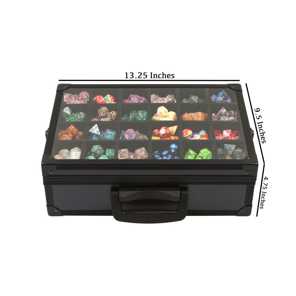 - SIZE: Exterior Dimensions 13.75" long x 9.5" wide x 4.5" tall. Interior Dimensions 13" long x 8.75" wide. 3 Removable, Divided Dice Storage Trays Holds up to 24 Polyhedral Dice Sets of 7 or 10 per tray. Each Section Can Hold 1 Set of 7 or 10 Standard Dice for a Total of up to 240 Dice per tray for a total of up 720 dice per case