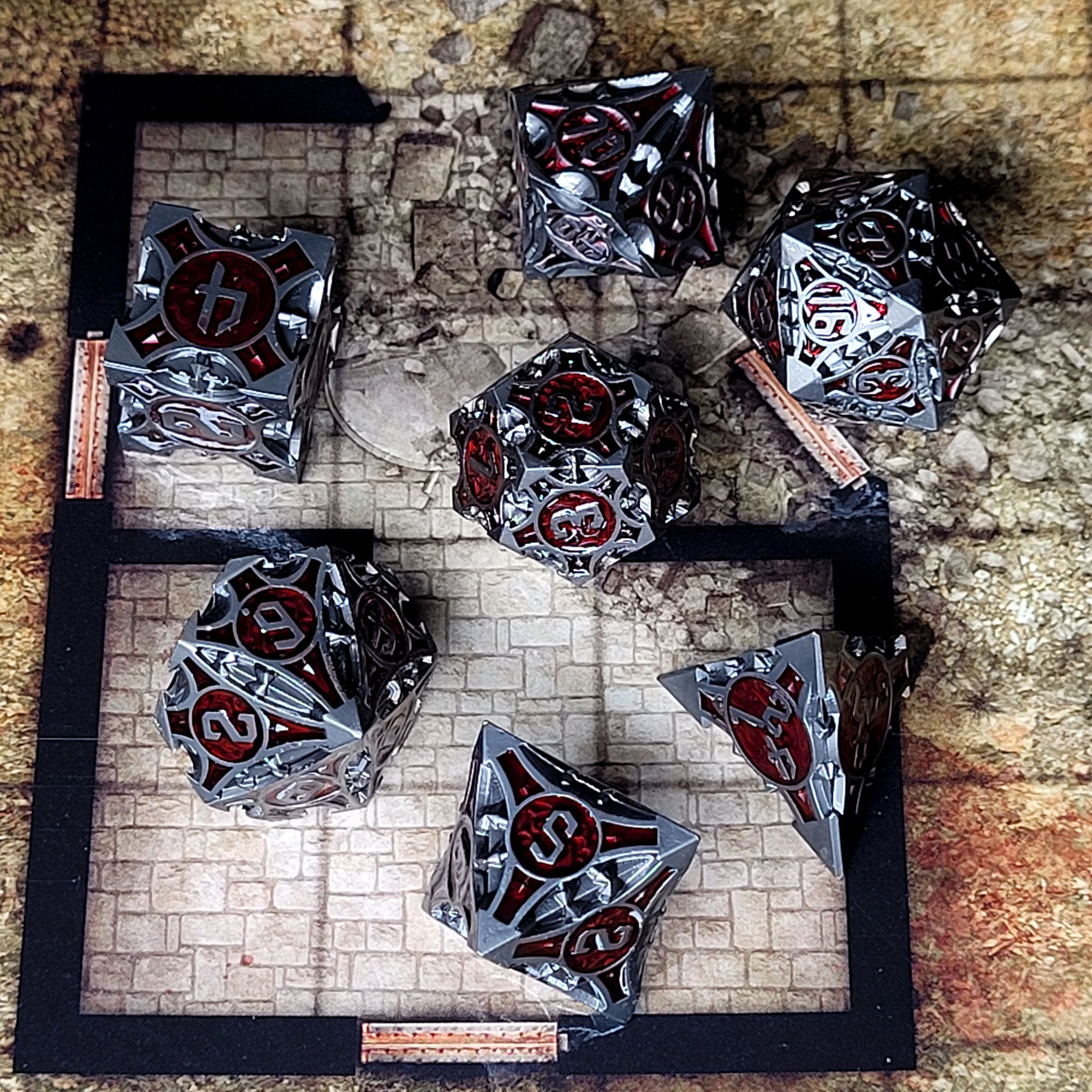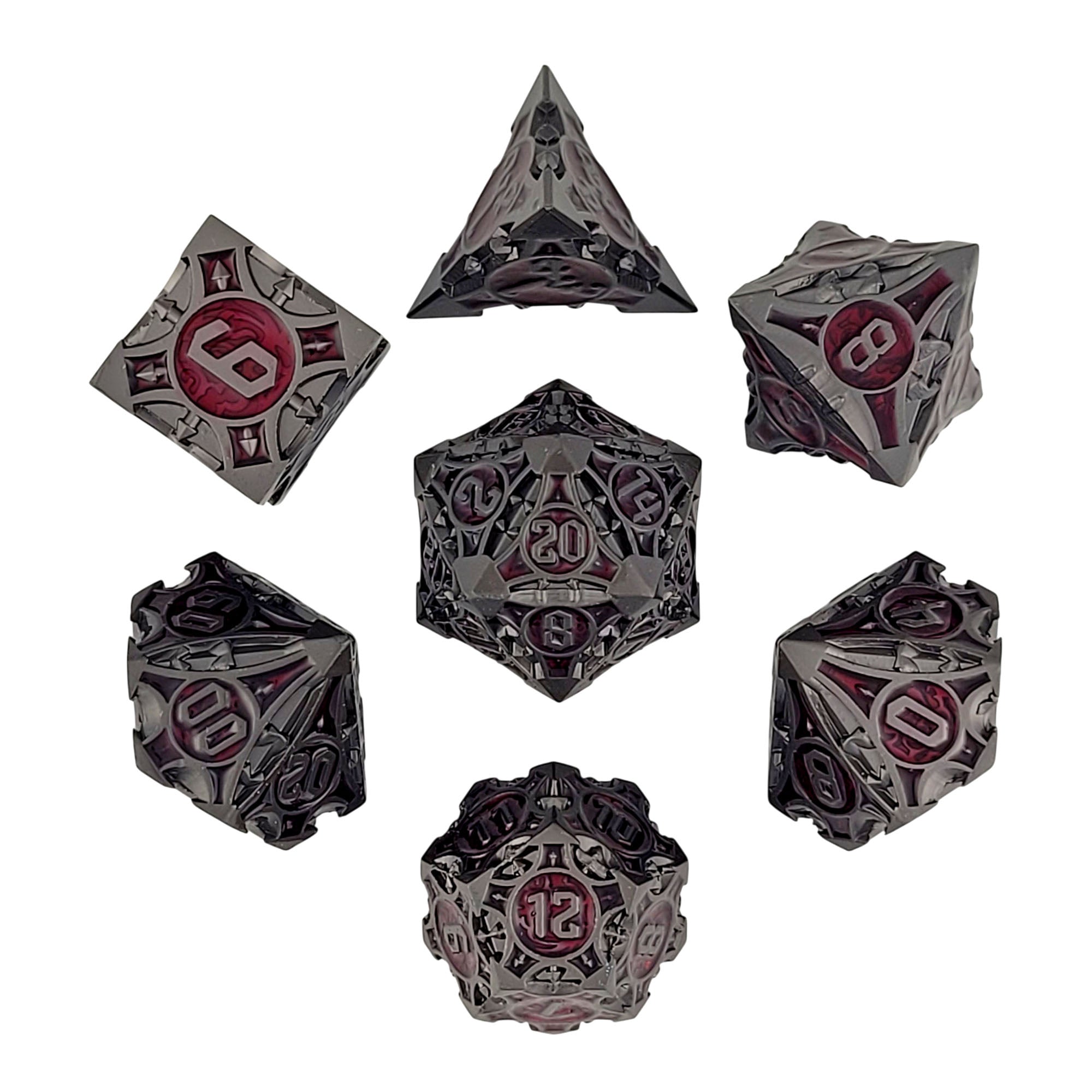 This solid metal RPG dice set features a mysterious array of arcane shapes and patterns in a matte gunmetal finish with a shimmering red accent.