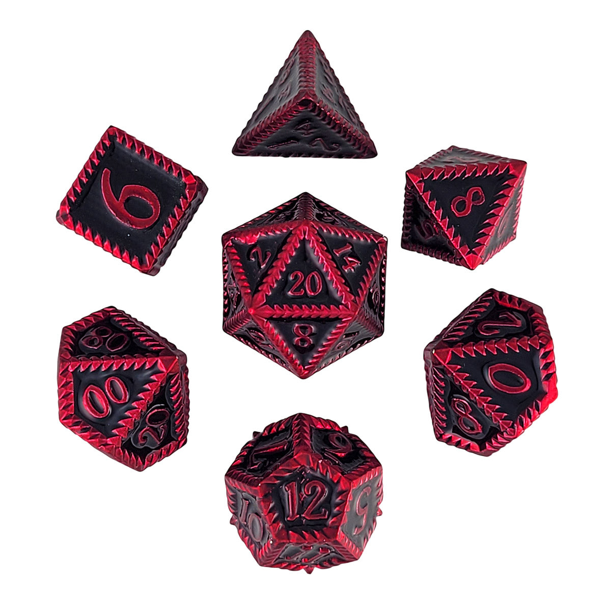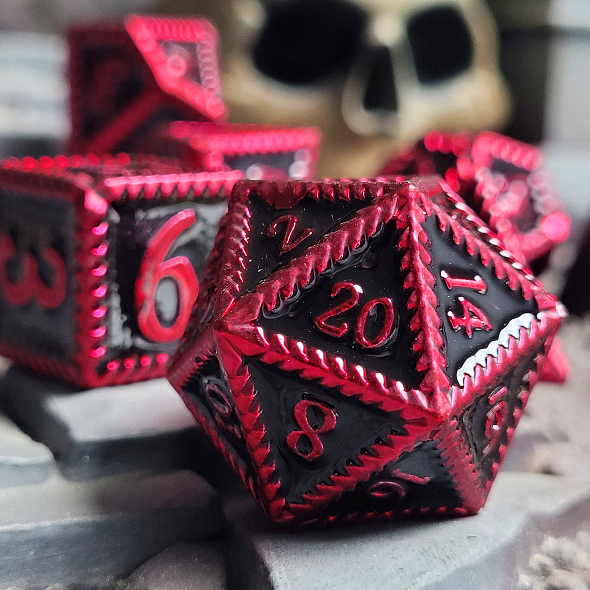 This RPG Dice Set features an outline of armored dragon scales, red framing, black enamel scaled faces with red numbers.