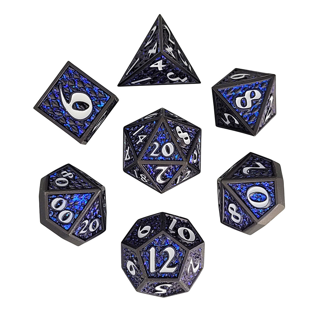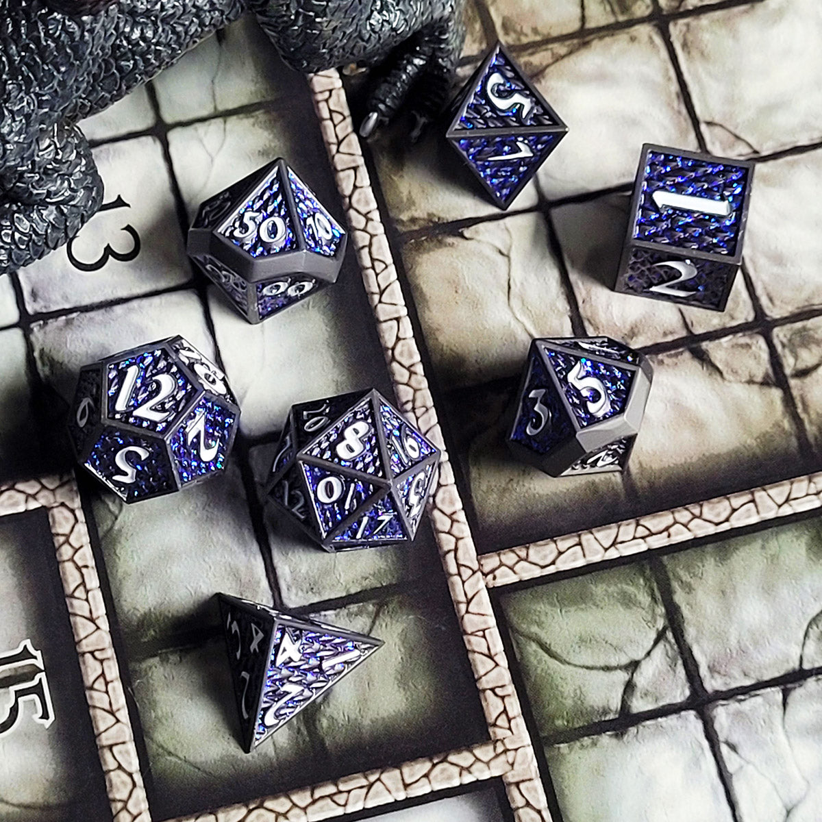 This solid metal RPG dice set features a detailed pattern of dragon scales in a matte gunmetal finish and blue glitter with white numbers.