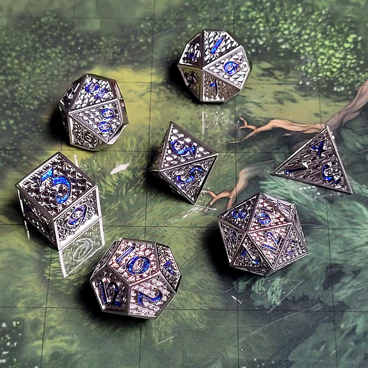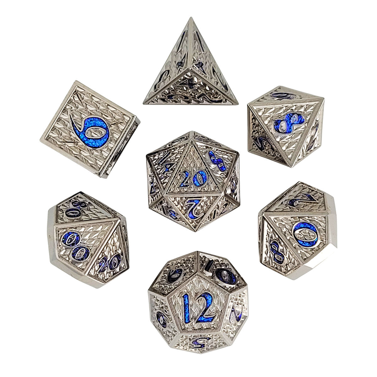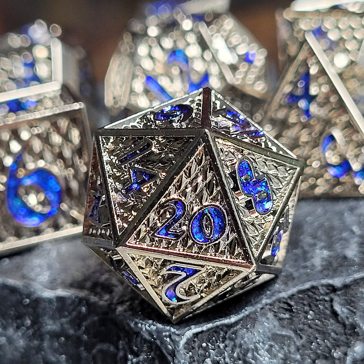 This solid metal RPG dice set features a detailed pattern of dragon scales in a Silver Chrome finish with blue glitter numbers.