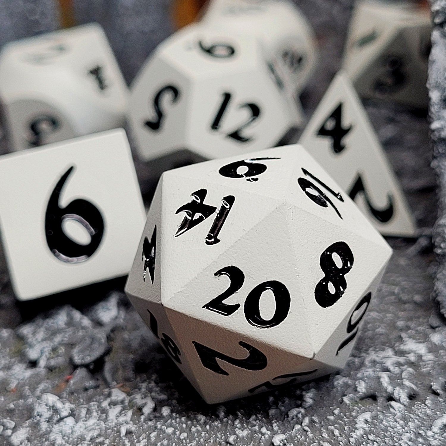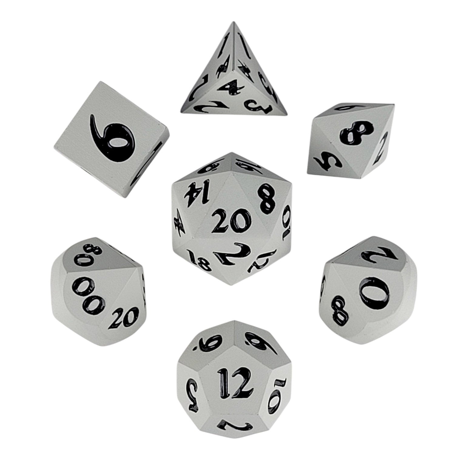 This solid metal RPG dice set features a matte monochrome (light grey) metal with black numbers.