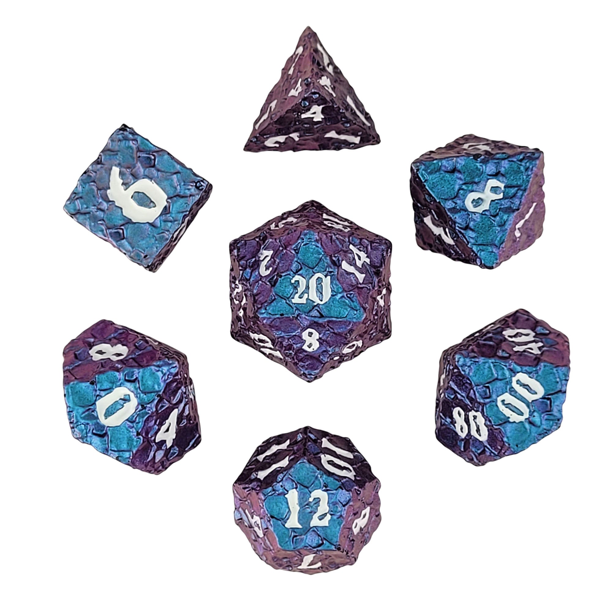 This solid metal RPG dice set features a solid blue/purple color shift metal with white numbers.