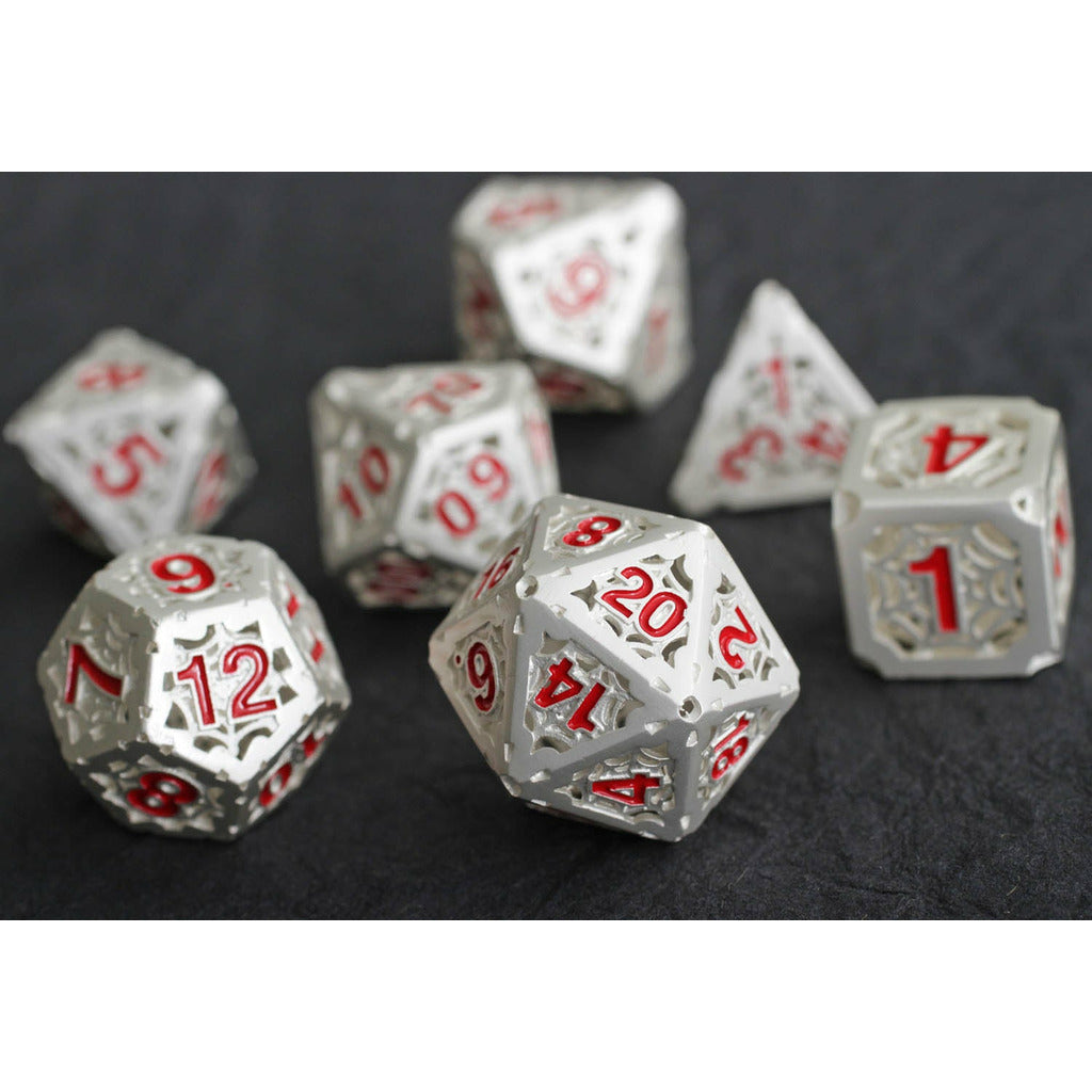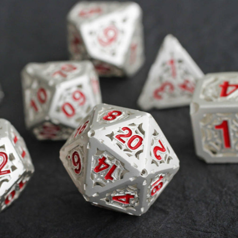 This unique all metal dice set is actually hollow. While sturdy enough to stand up to regular use, this set is light as a feather...or well at least as light as hollow metal and makes a distinctive tinkling chime when rolled.