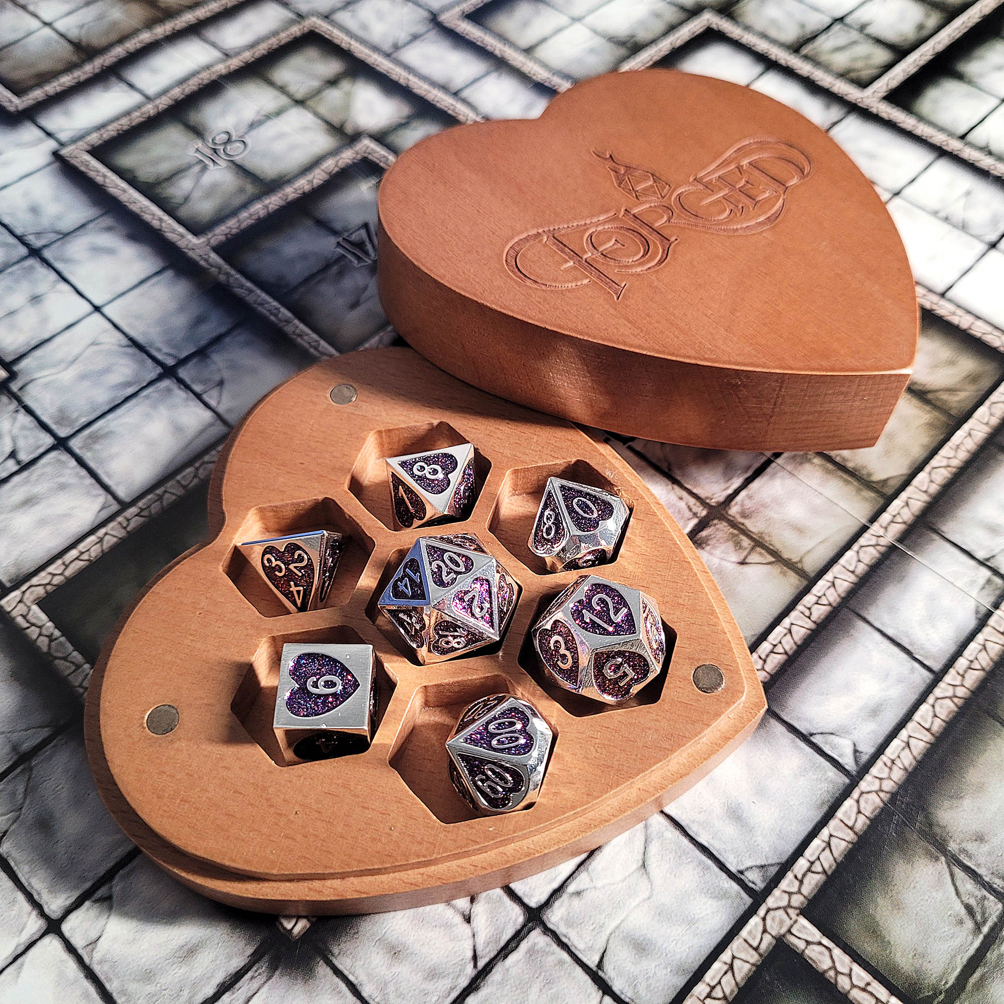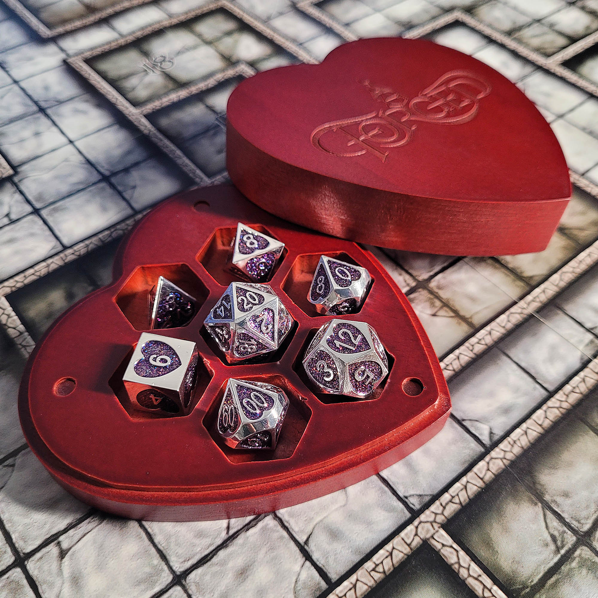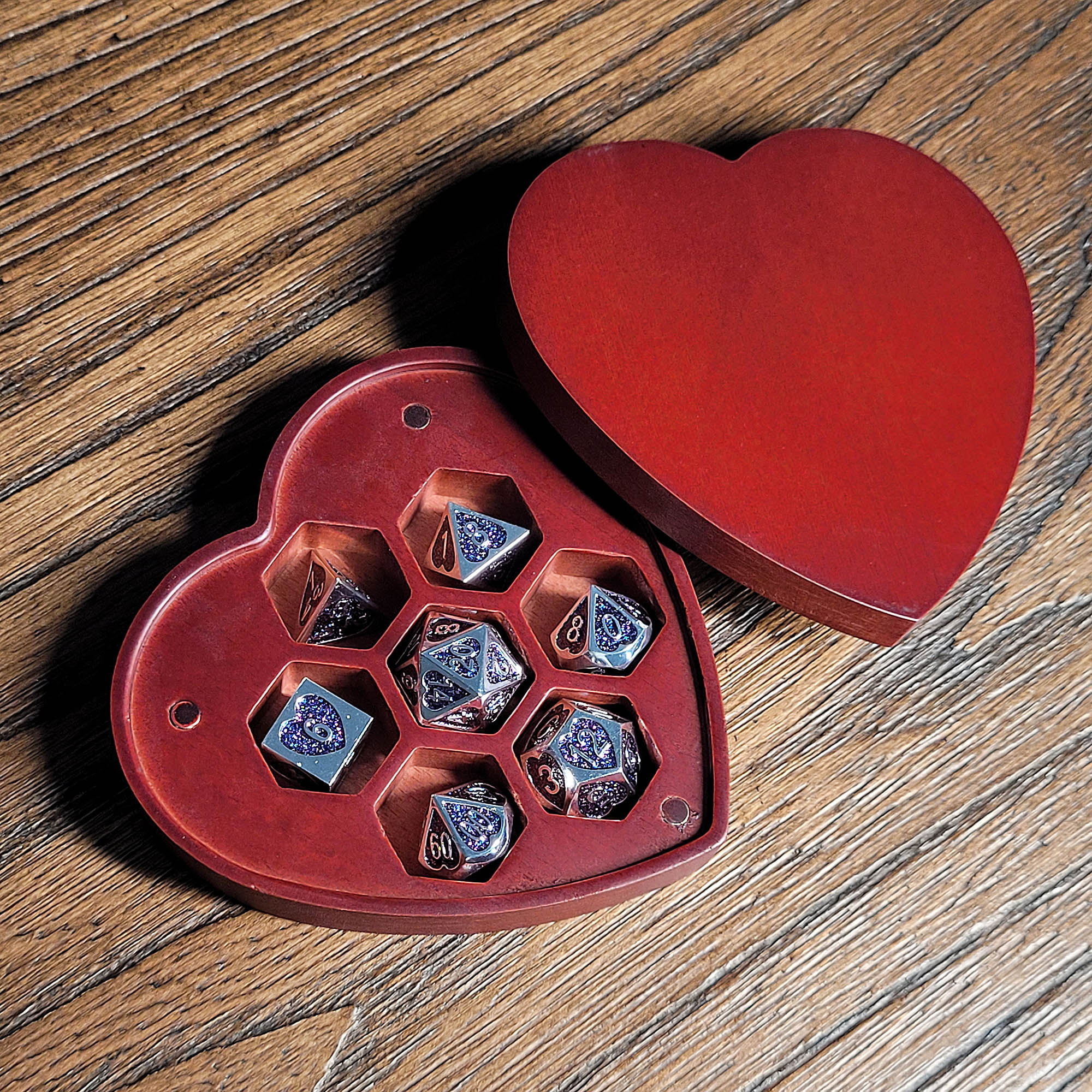 Comes in a collectible custom heart-shaped display box with compartments for each dice.