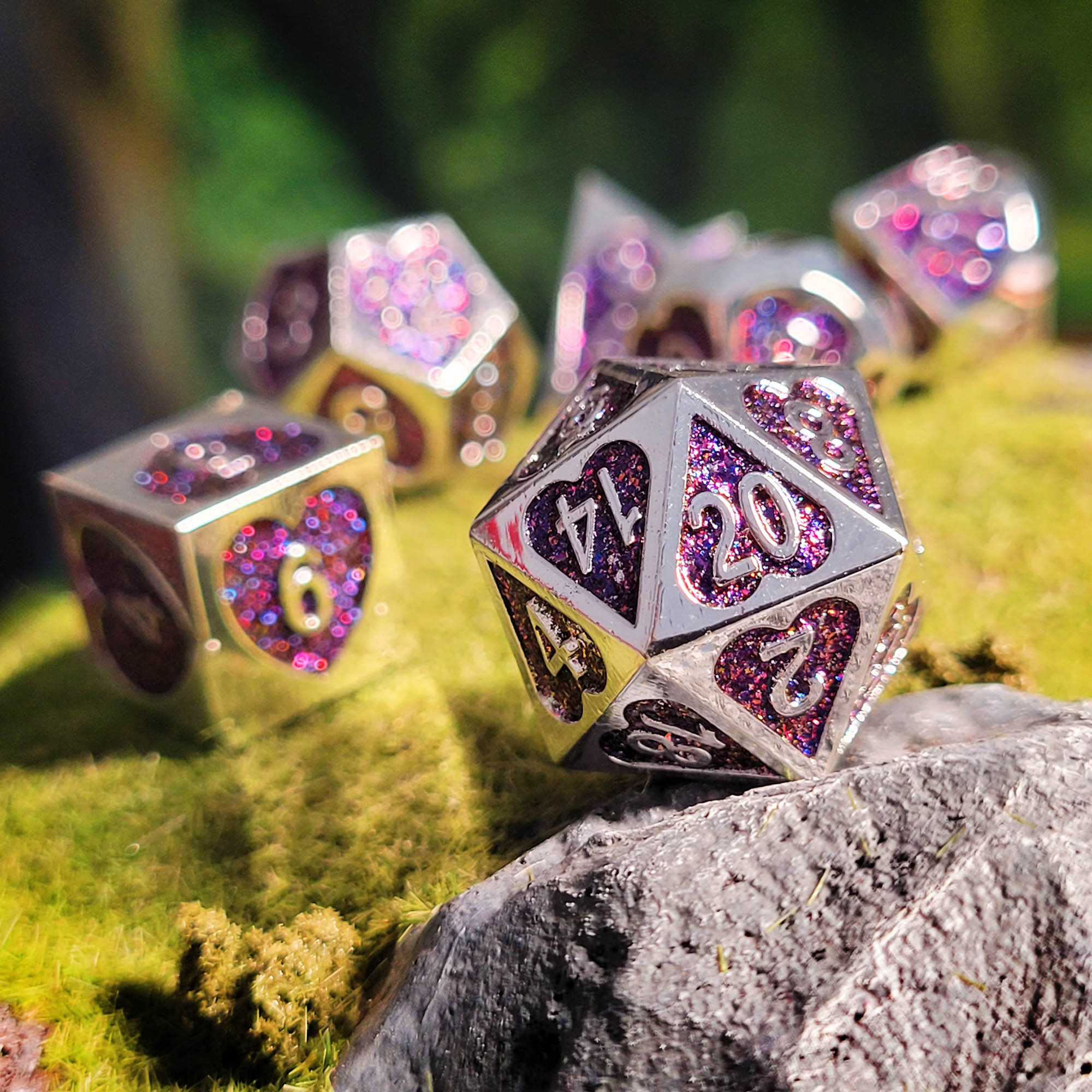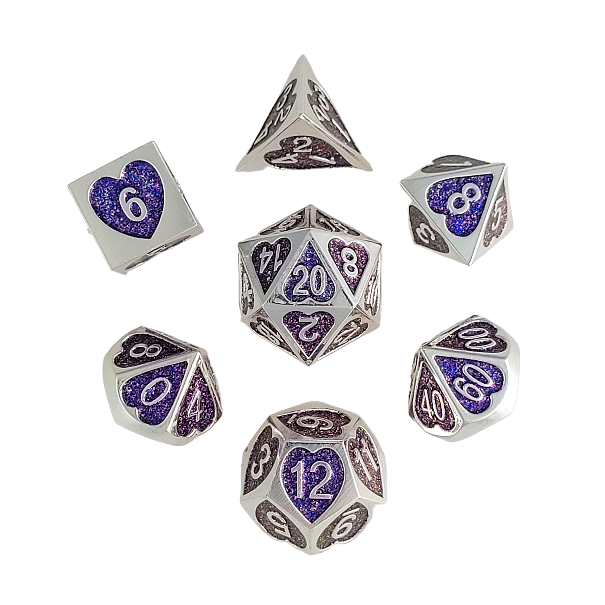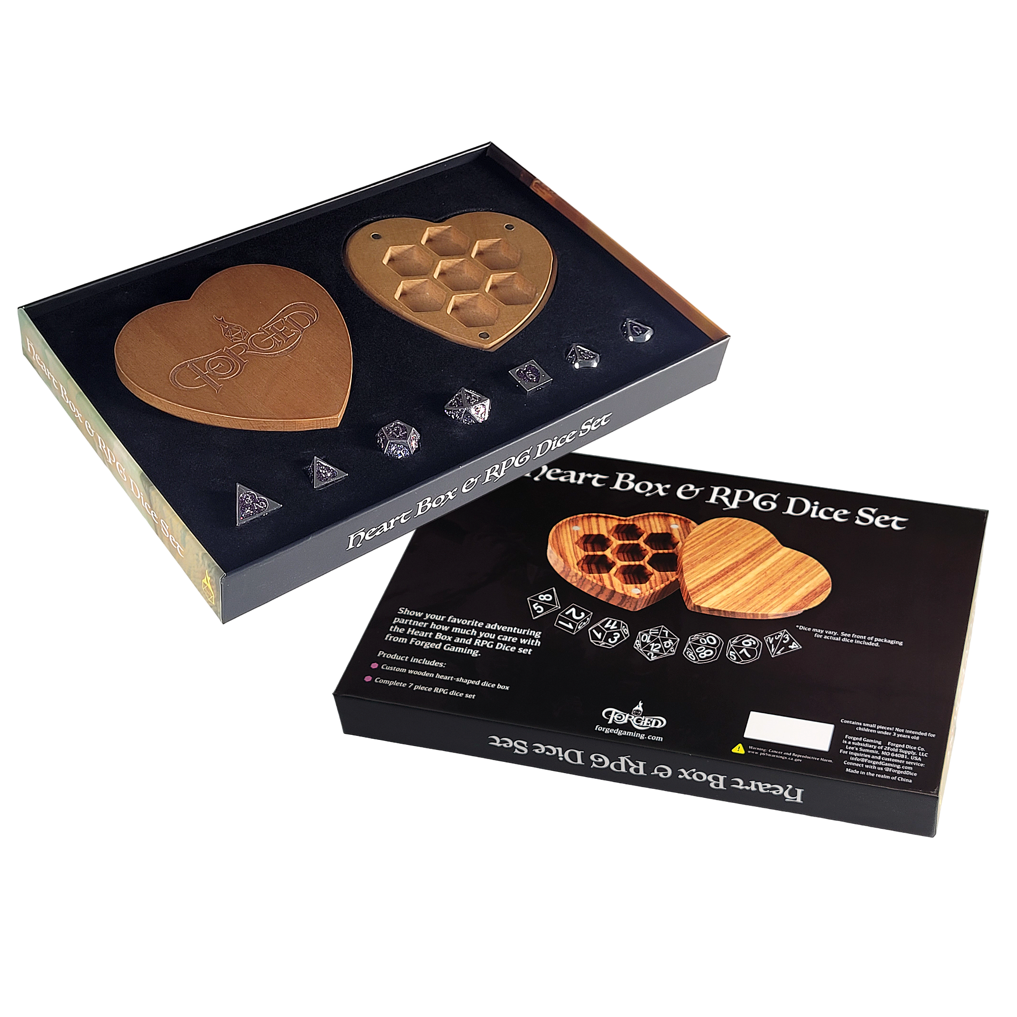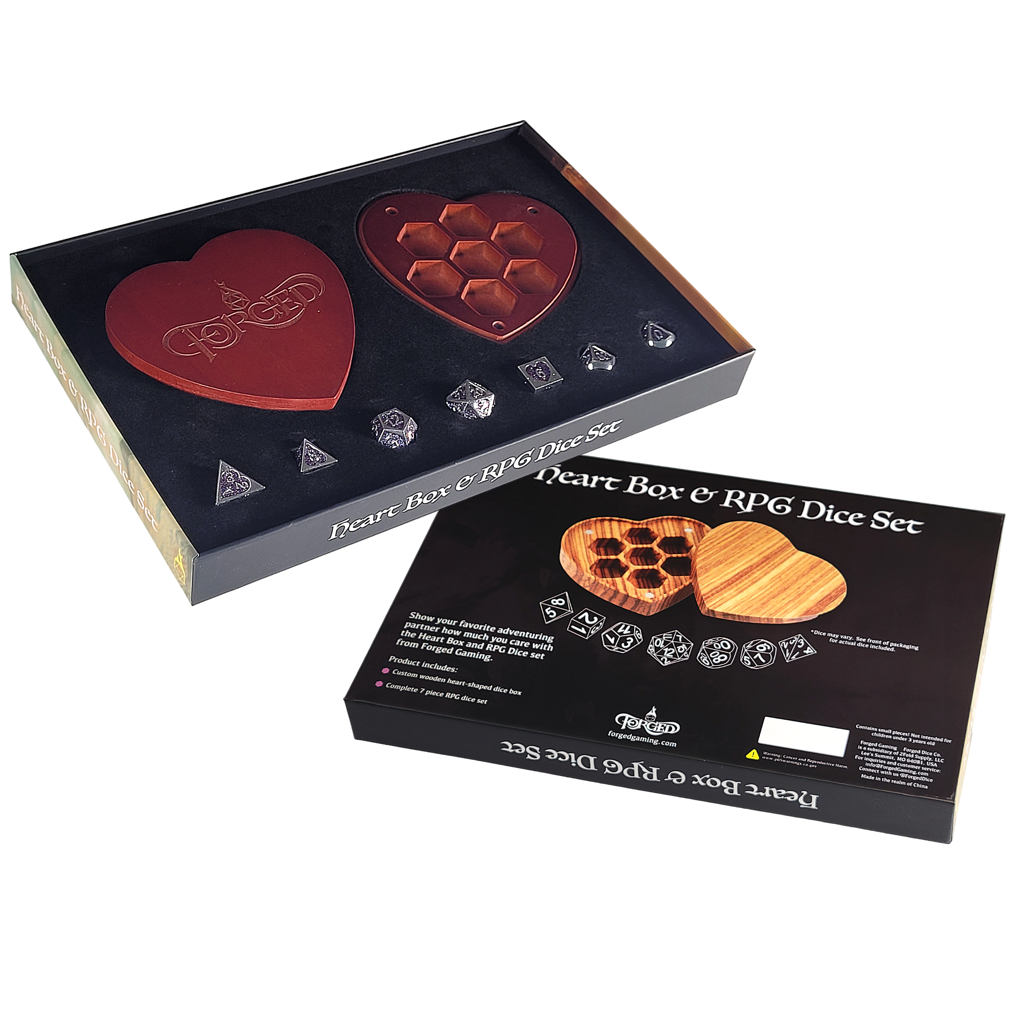 Comes in a collectible custom heart-shaped display box with compartments for each dice.
