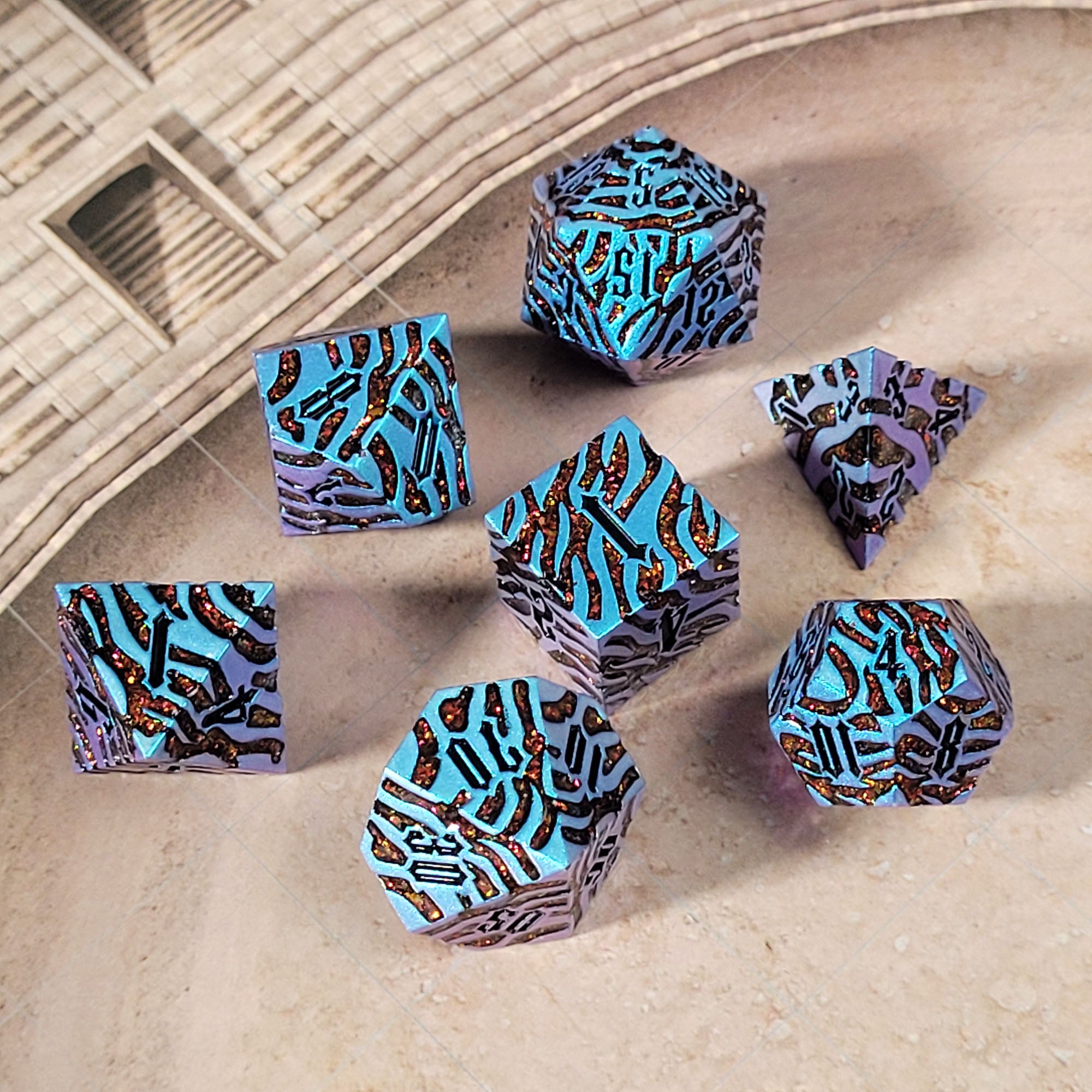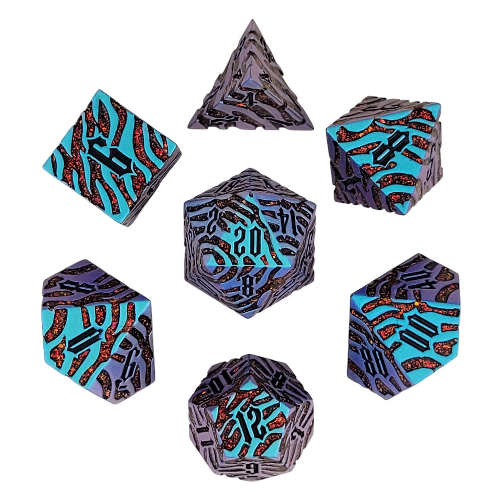 This set features a Tiger Stripe pattern filled with red glitter and a unique blue color shift metal finish.