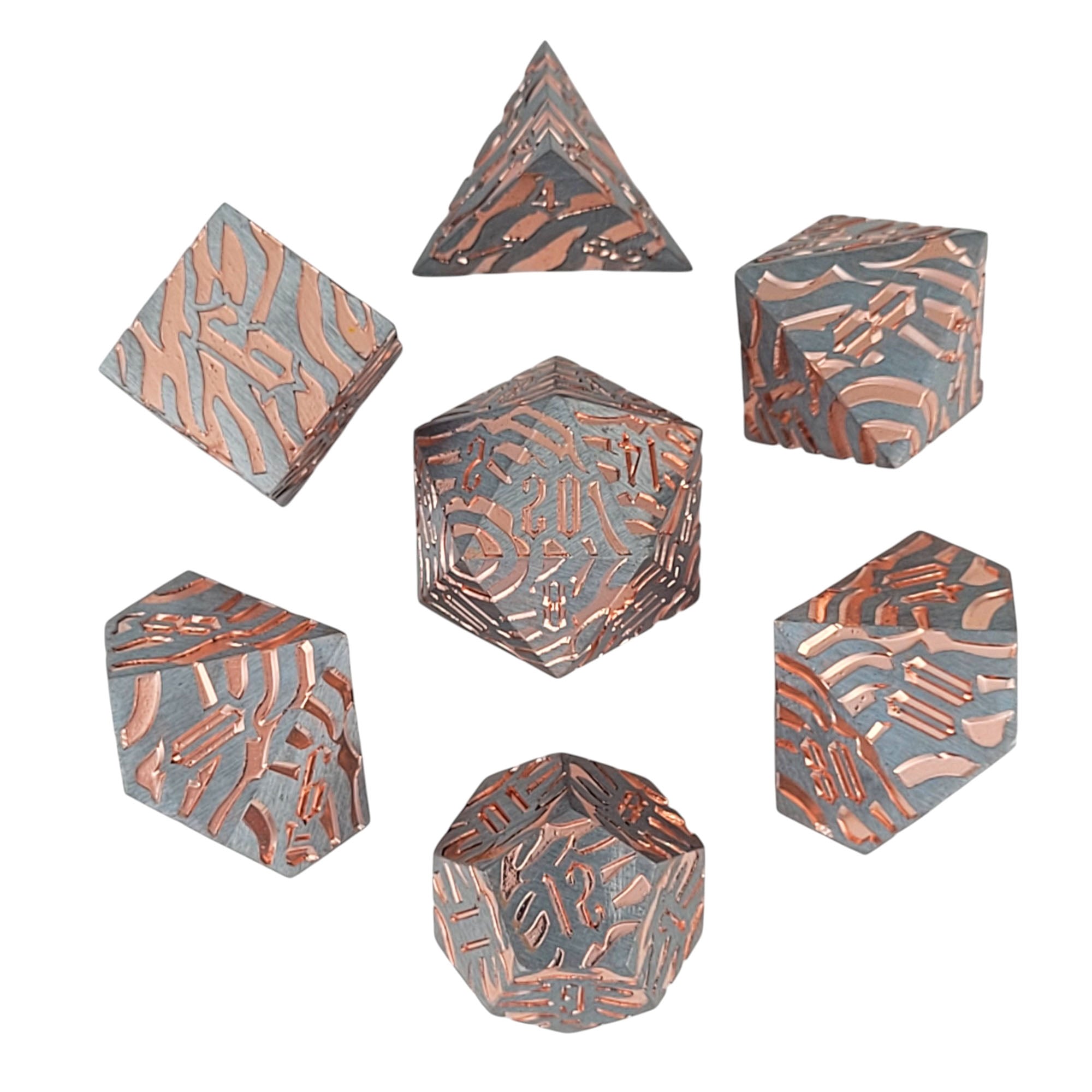 This set features a Tiger Stripe pattern filled with copper foil and a brushed steel metal finish.