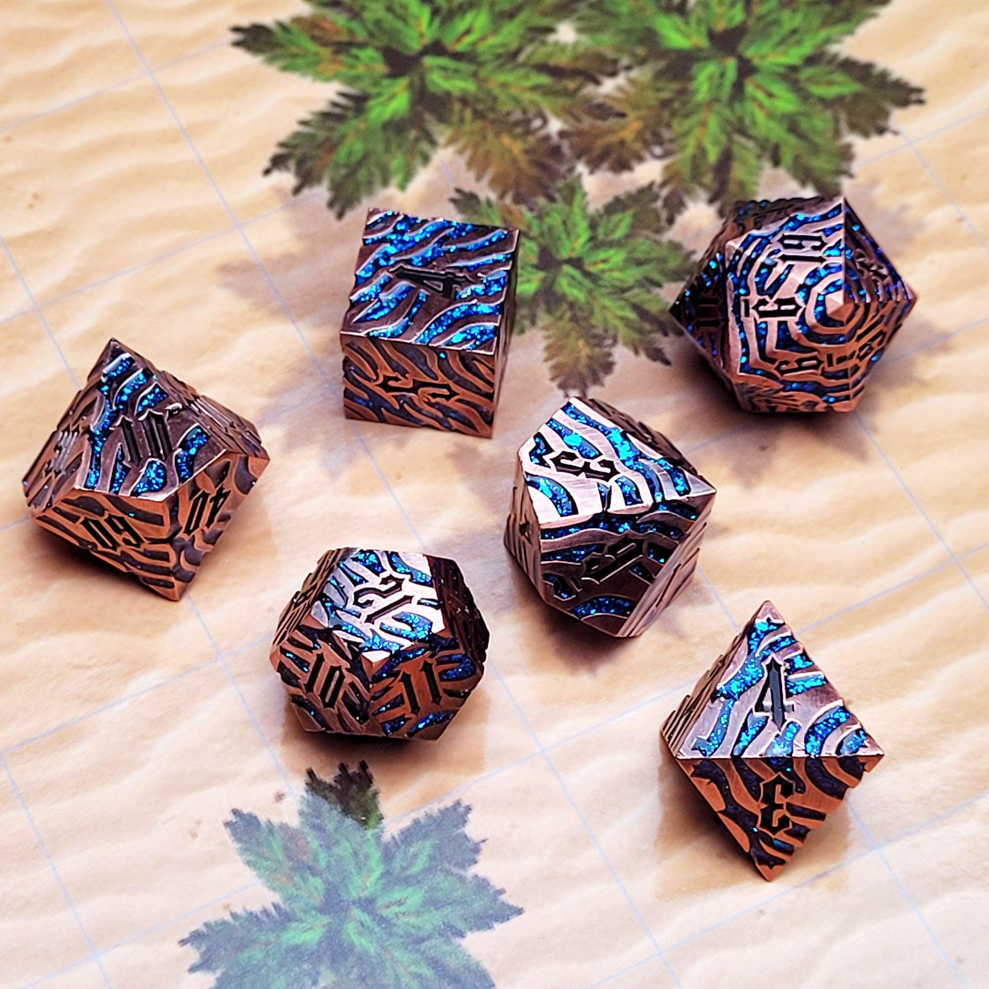 Tiger Stripe Copper Blue Glitter Metal RPG Dice Set of 7