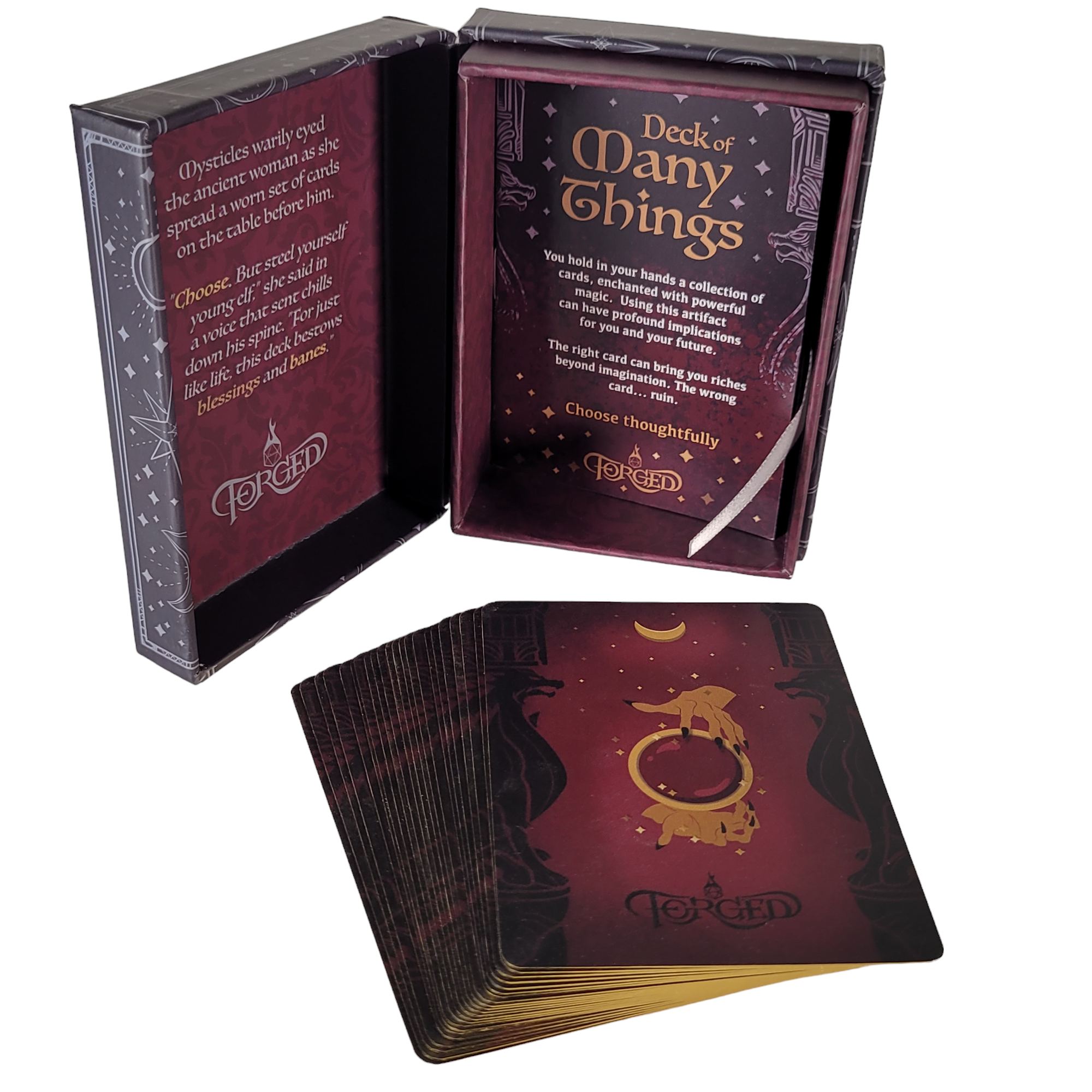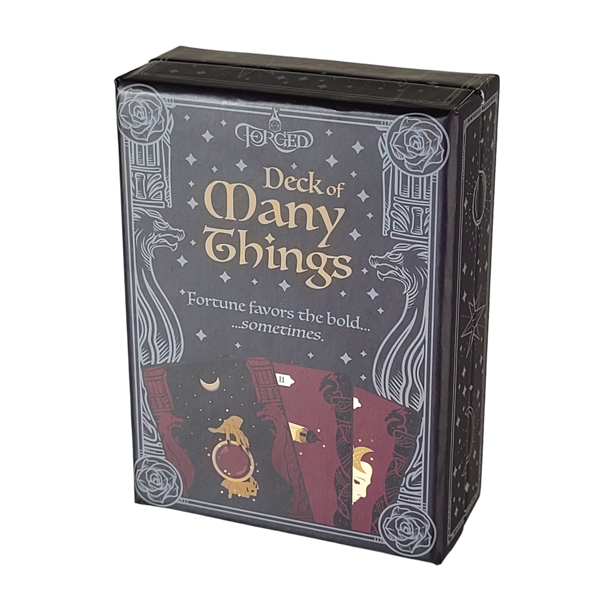 Treat or torment your players with wonderful boons and woeful banes of the Deck of Many Things in your next game. And don't forget to share your adventures by hailing us on Facebook and Instagram @forgeddice today!