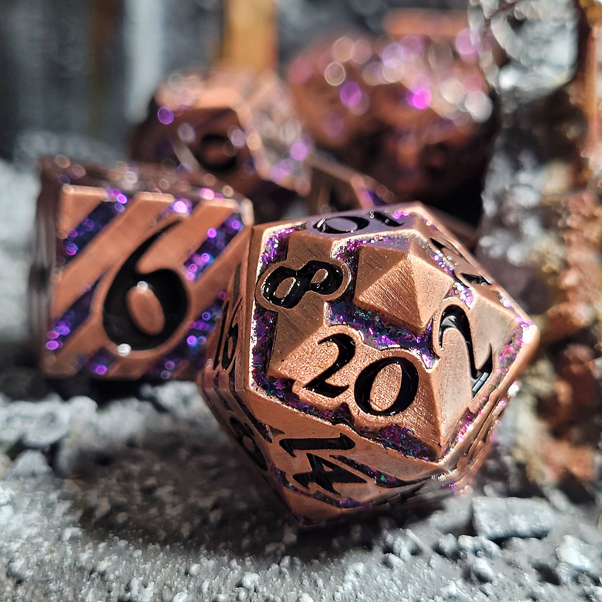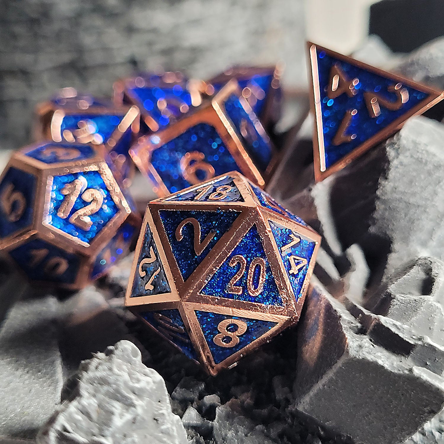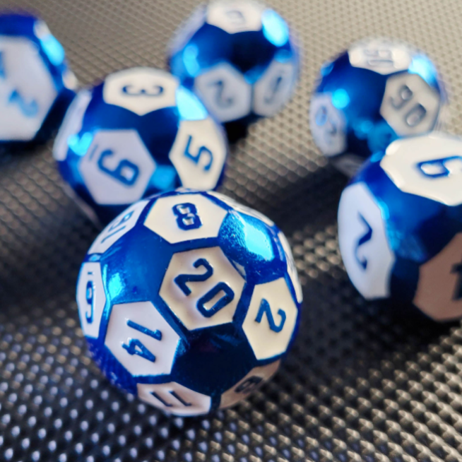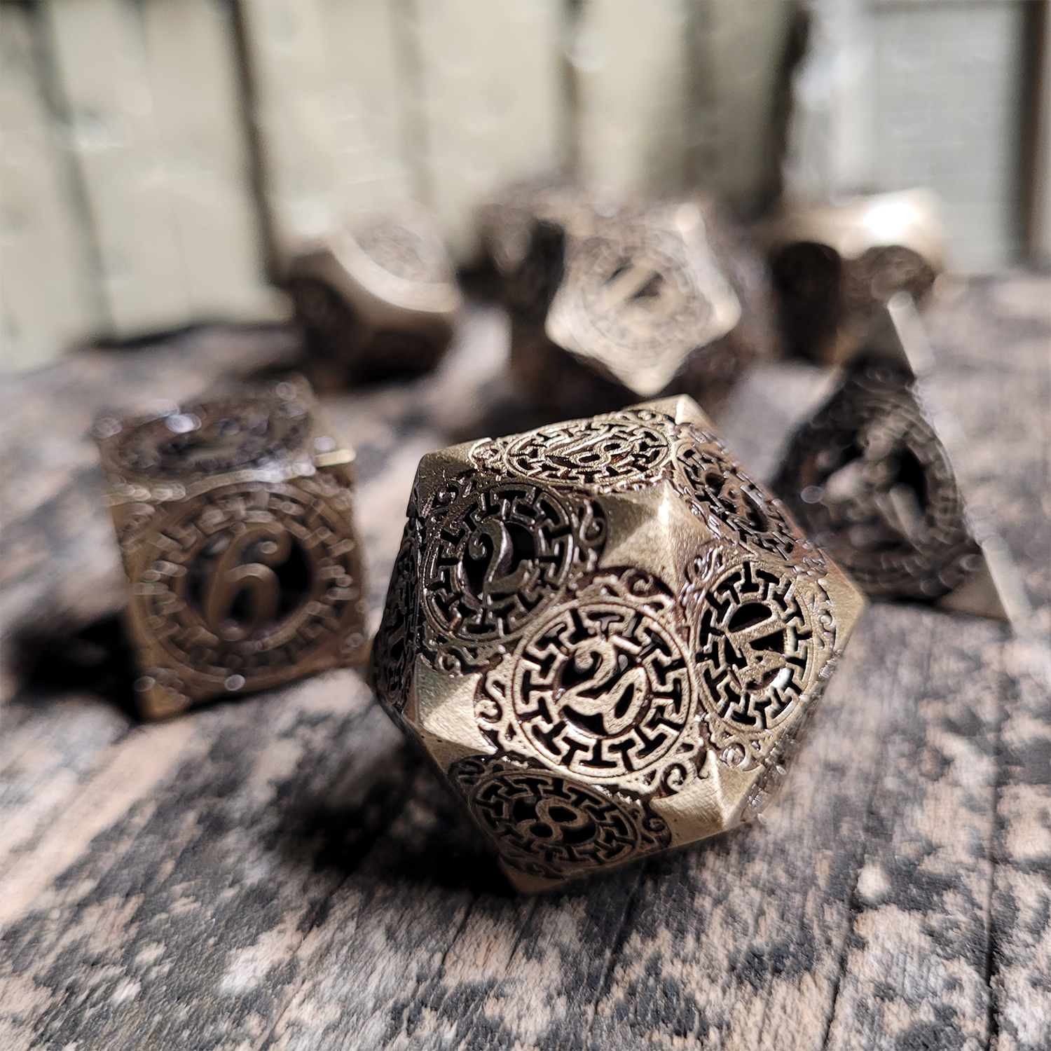 DETAILS: 7-piece polyhedral metal dice set containing a D20: 21mm, D12: 19mm, D10 (marked 00-90): 16mm, D10 (marked 0-9): 16mm , D8: 16mm, D6: 16mm, D4: 18mm