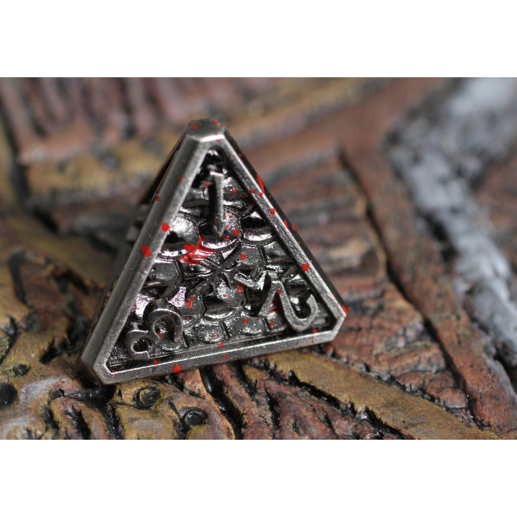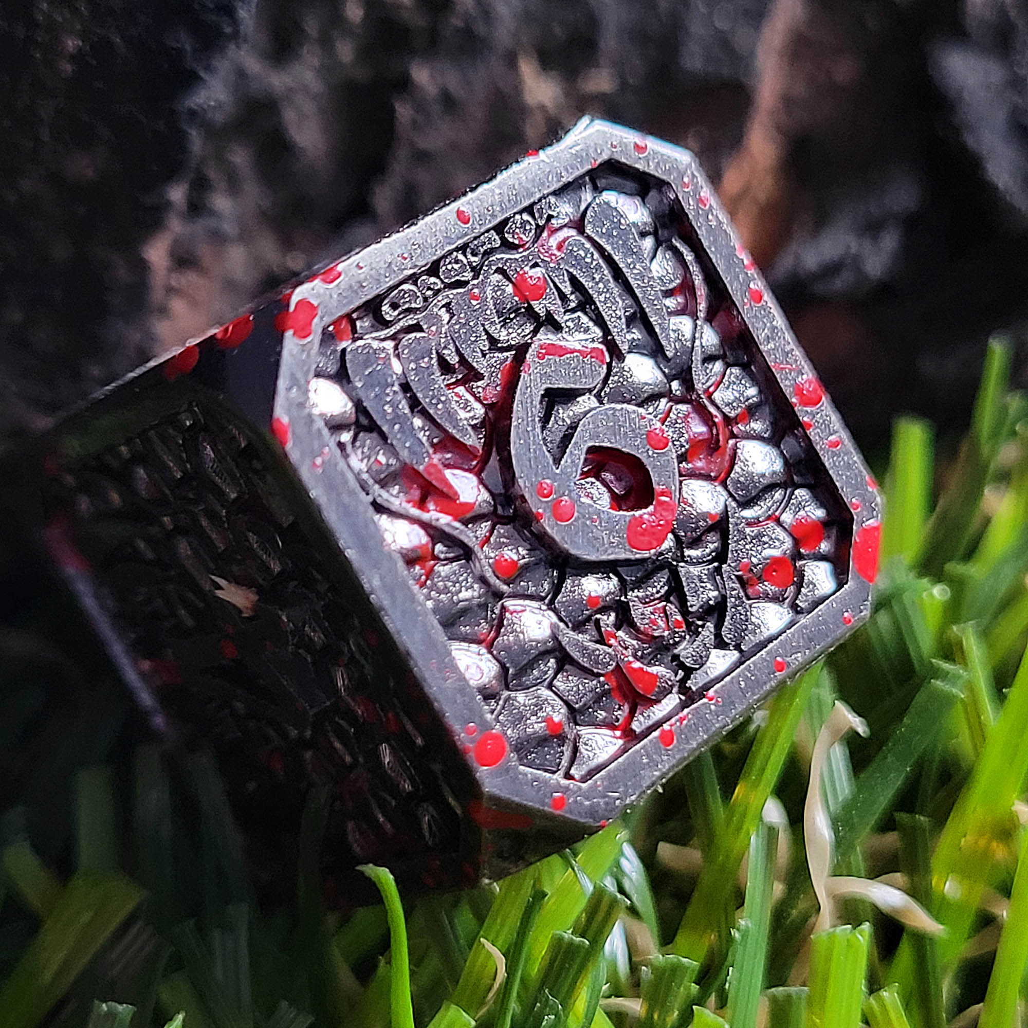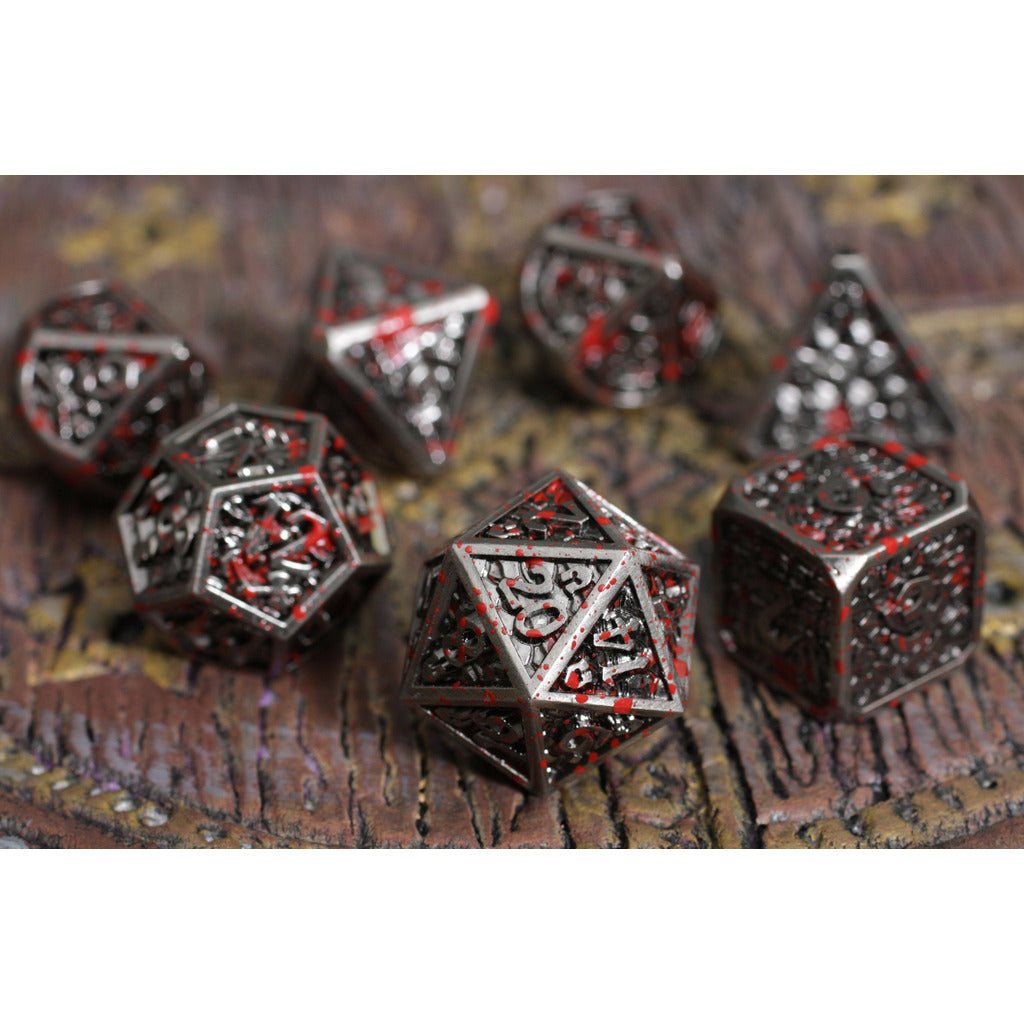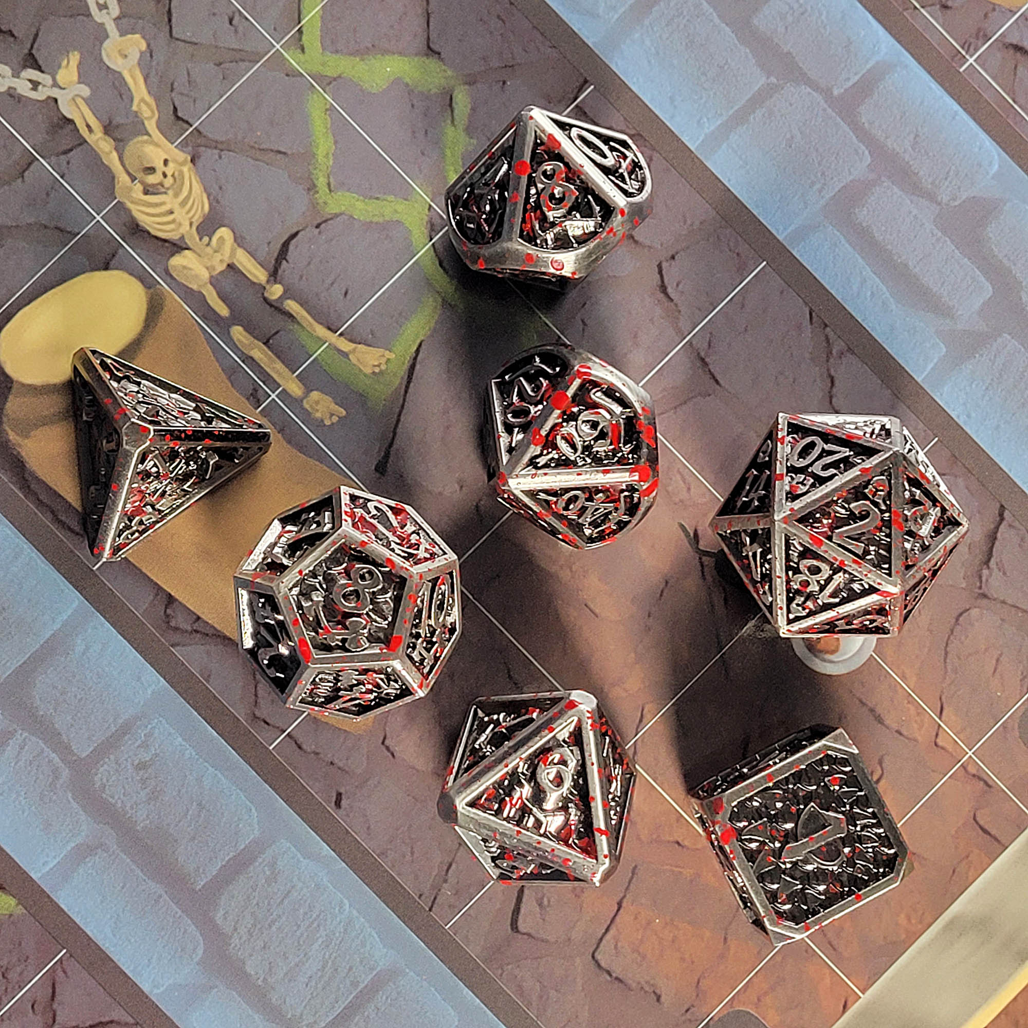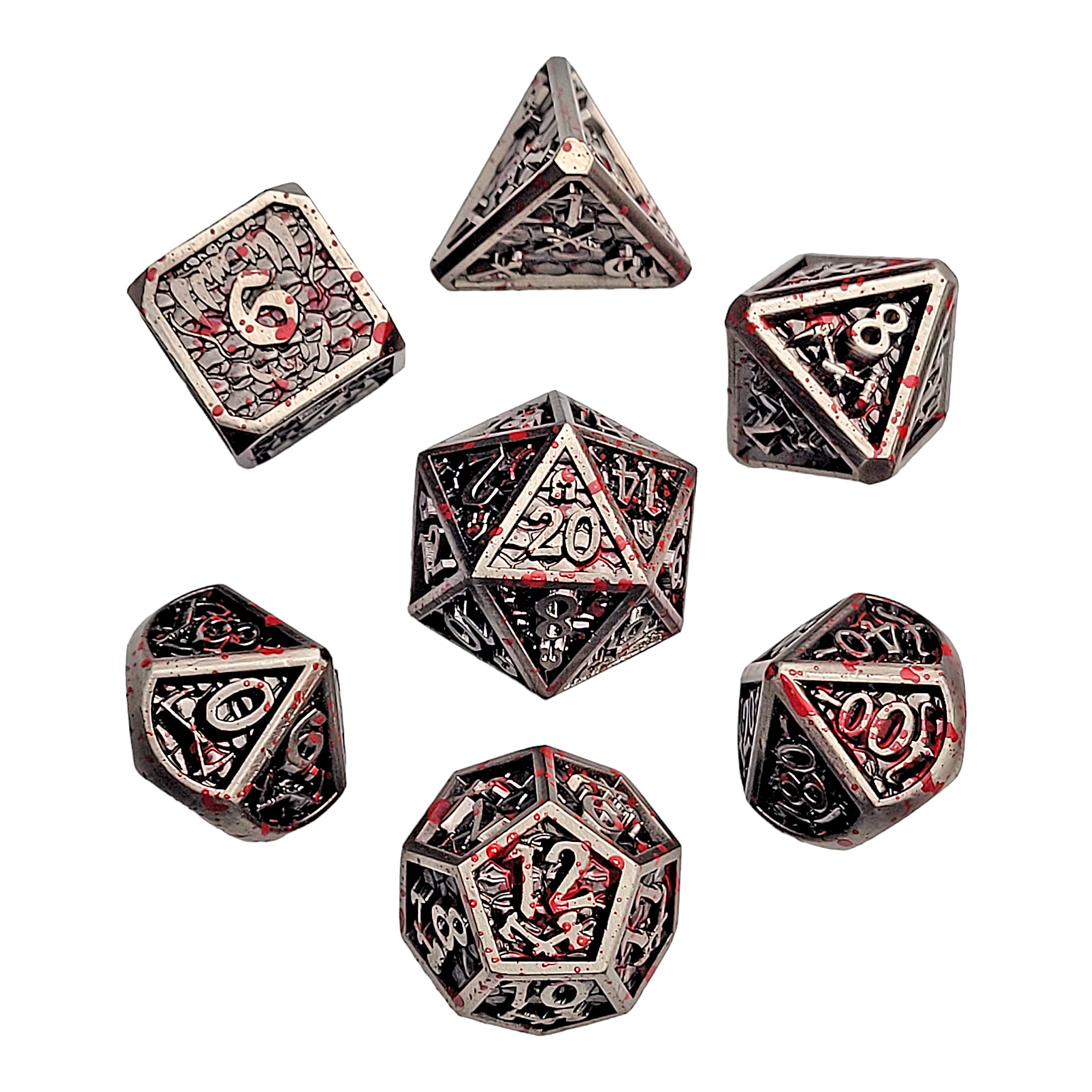 APPEARANCE: This blood splattered silver RPG Dice Set features a scaled background with detailed relief images of the trials and tribulations of adventuring