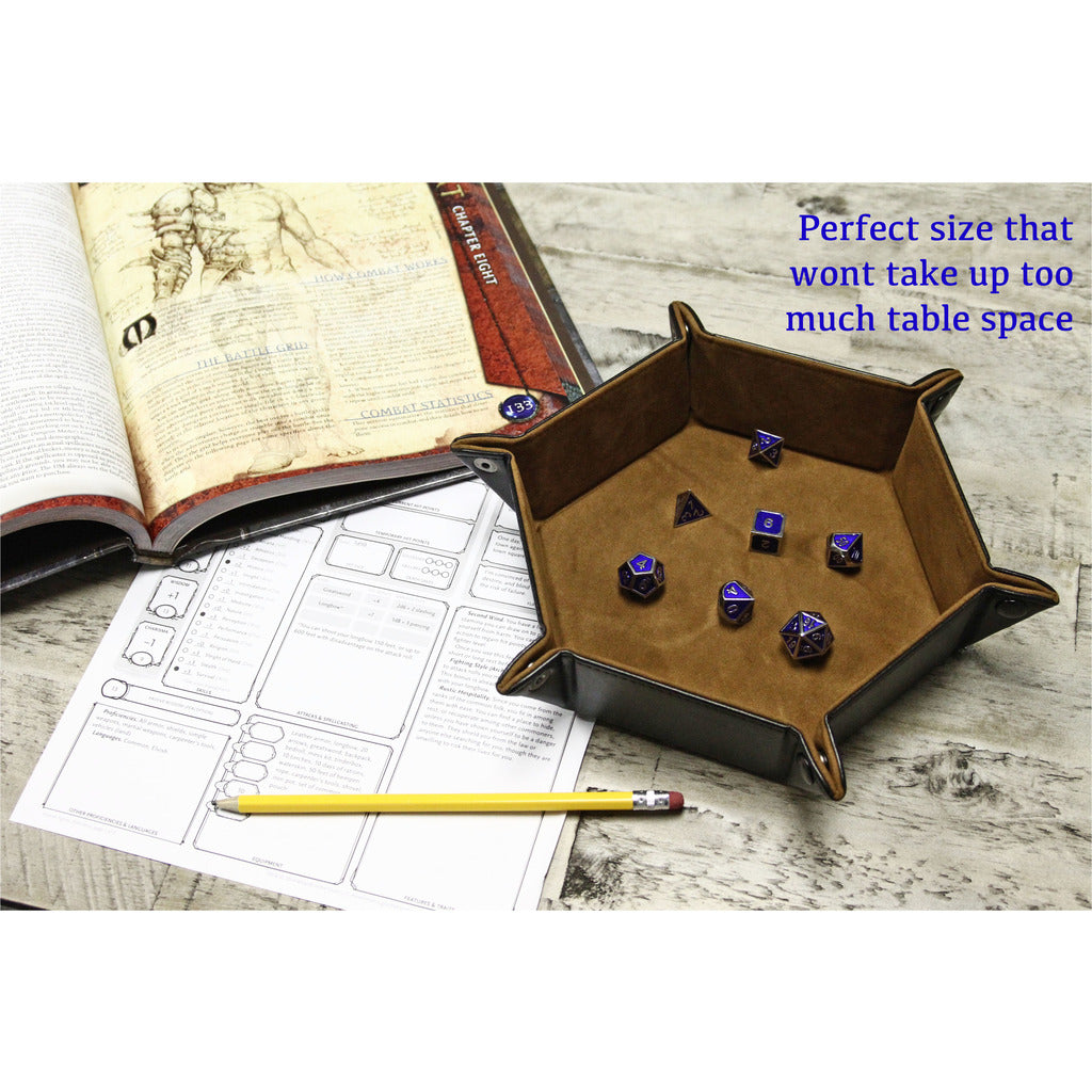 - 2 inch Deep Dice Tray and 6.5 inch interior rolling surface – Cast your dice into a gladiatorial chamber built for heroic battle.  Hexagon shape measures: FLAT: 10.75 inches - FOLDED: 6.5 inches across by 2 inches deep