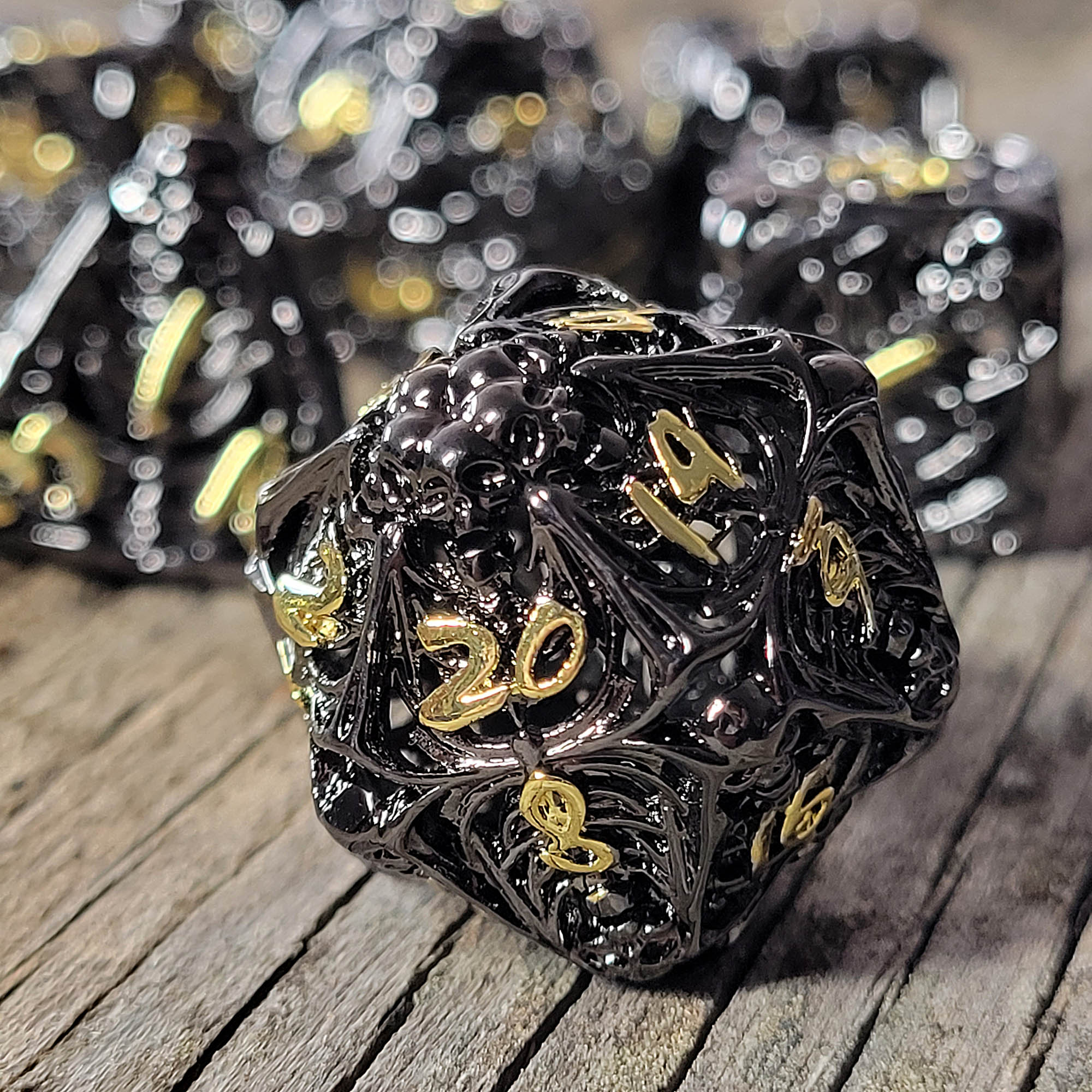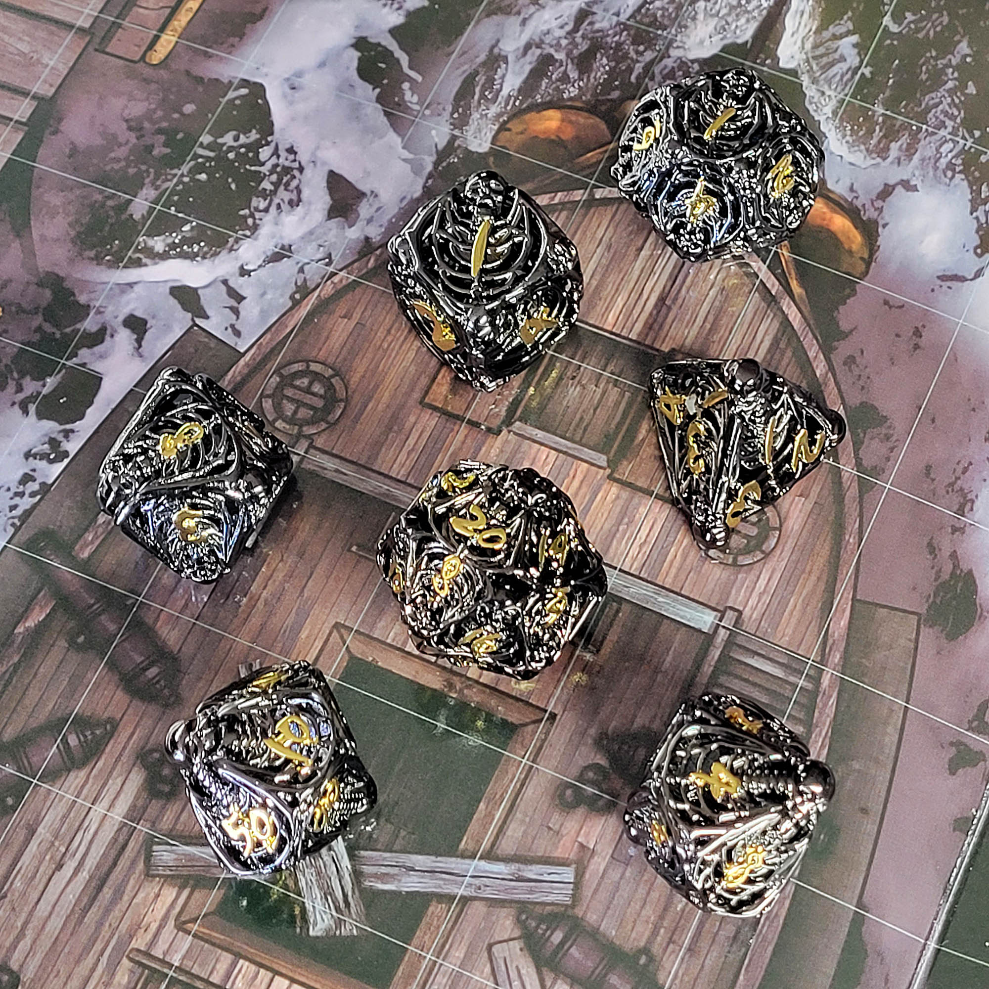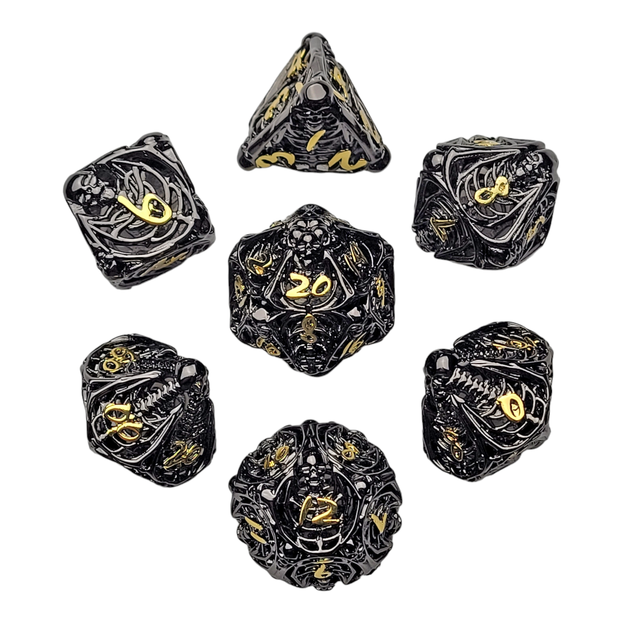 Lich's Throne Black Gold Hollow Metal RPG Dice Set