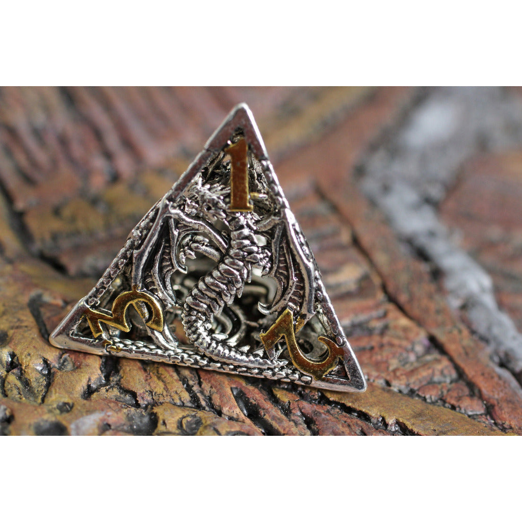 APPEARANCE: This RPG Dice Set features a polished silver featuring rampant dragons on each face with bright gold numbers.