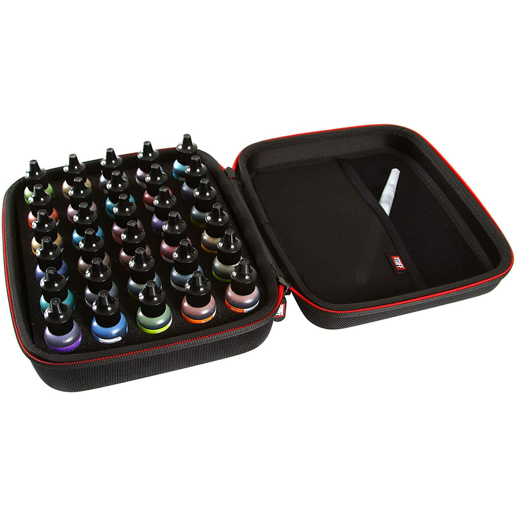 PERFECT FIT: This awesome case has 30 individual compartments and will fit many popular miniature paints like Reaper, Vallejo, and Army Painter. It will fit any paint or ink bottle up to 3" tall and 1" wide.