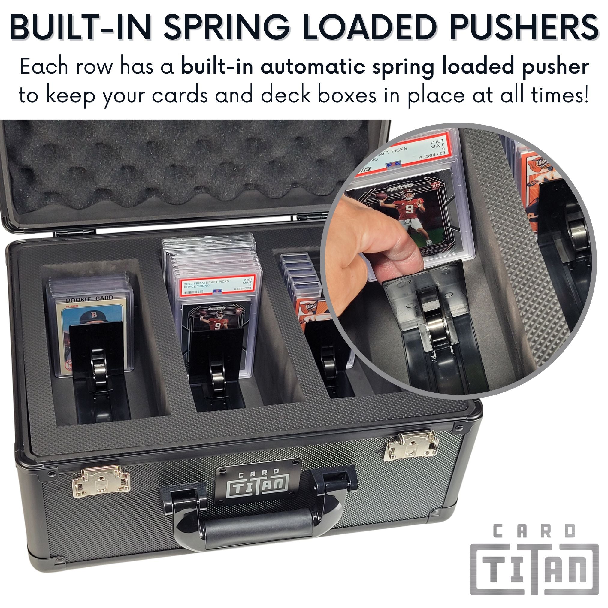 Each row has a built-in automatic spring loaded pusher to keep your cards and deck boxes in place at all times!