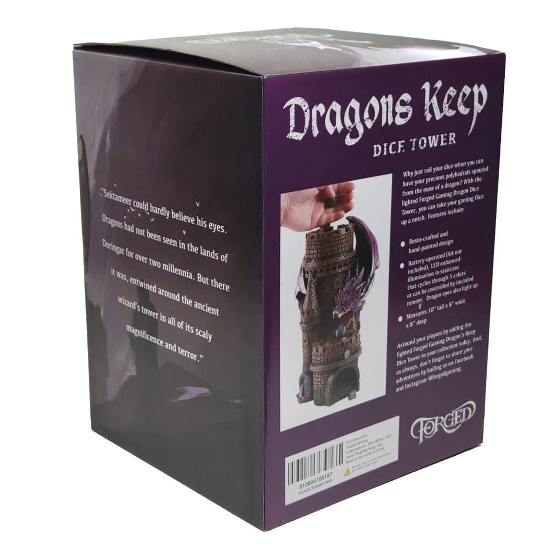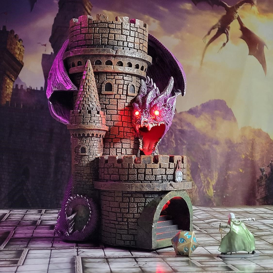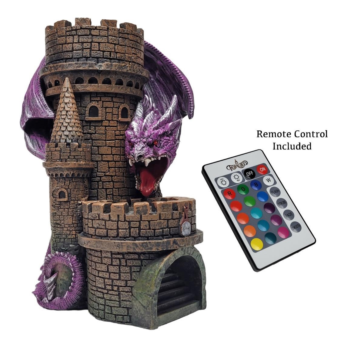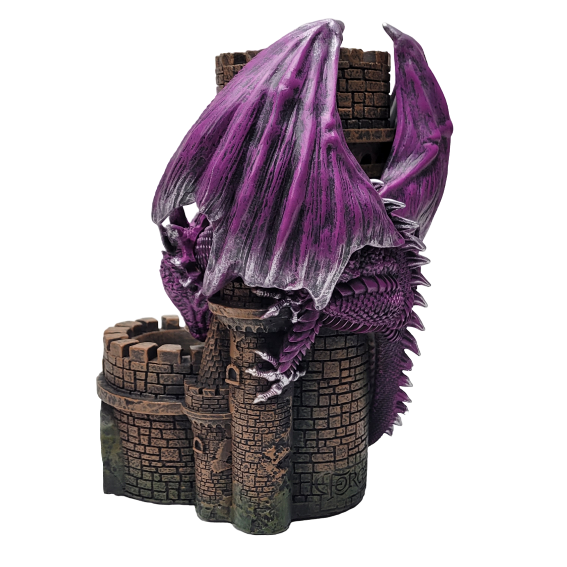 Test your fate with the expertly crafted remote controlled Dragons Keep resin dice tower! This hand-painted, heavy brownstone tower is being protected (...or attacked?!) by a large purple dragon! The Dragons Keep makes an awesome tabletop piece for any RPG adventure.