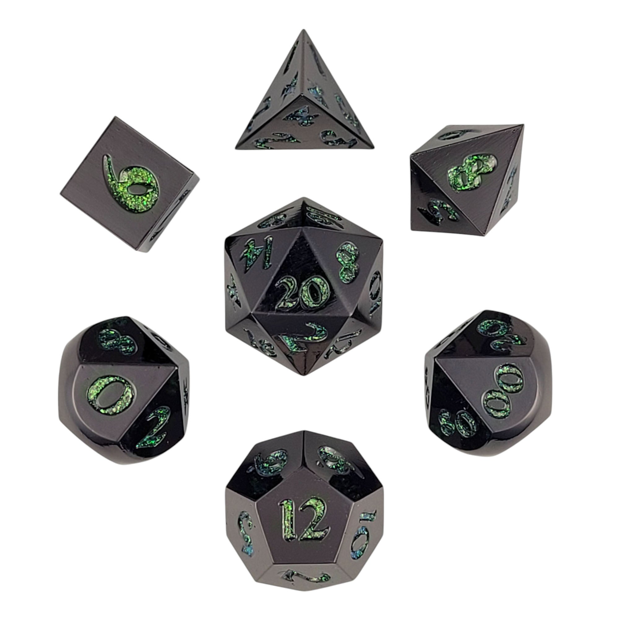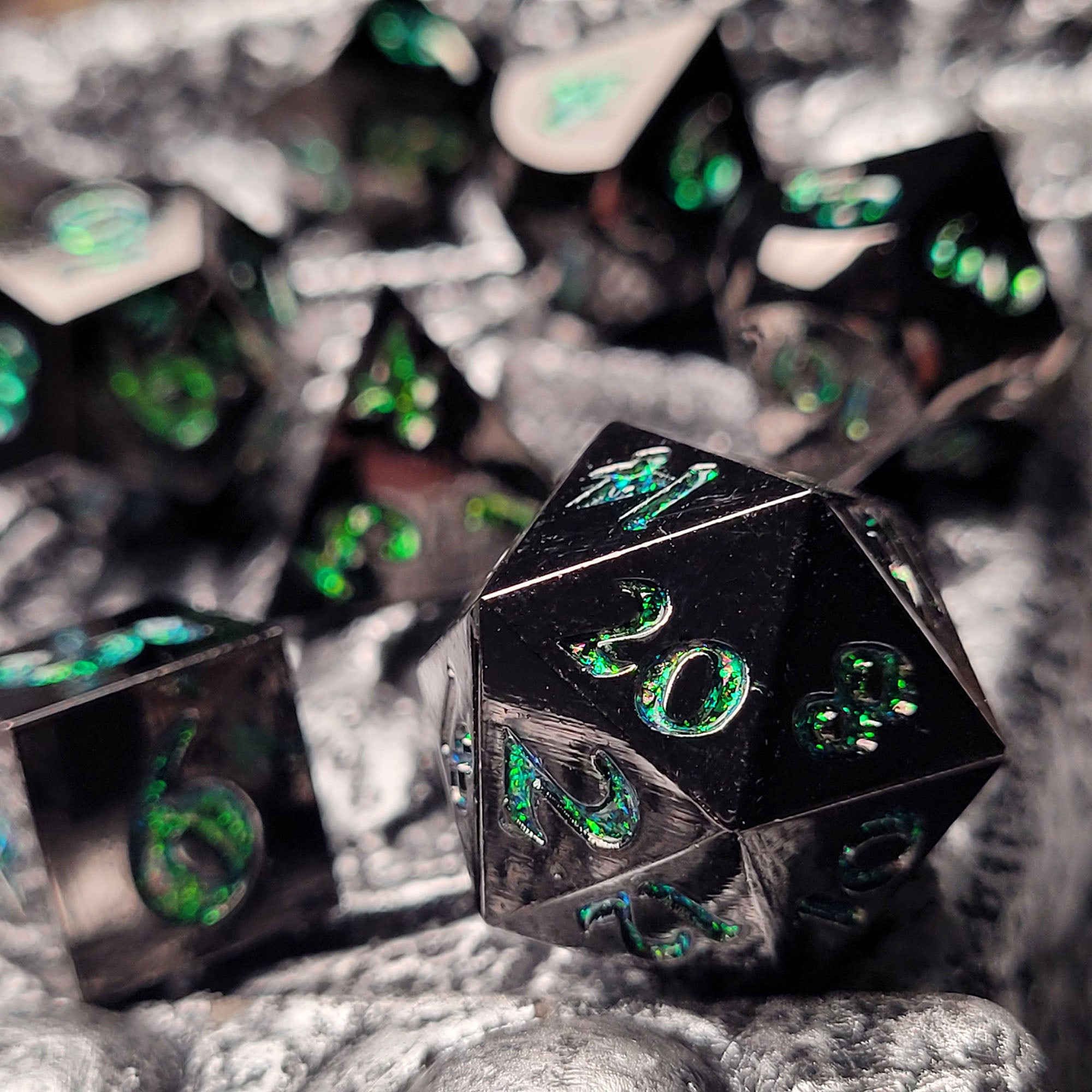 This signature dice features a polished gunmetal finish and our large signature font numbers filled with green mica.