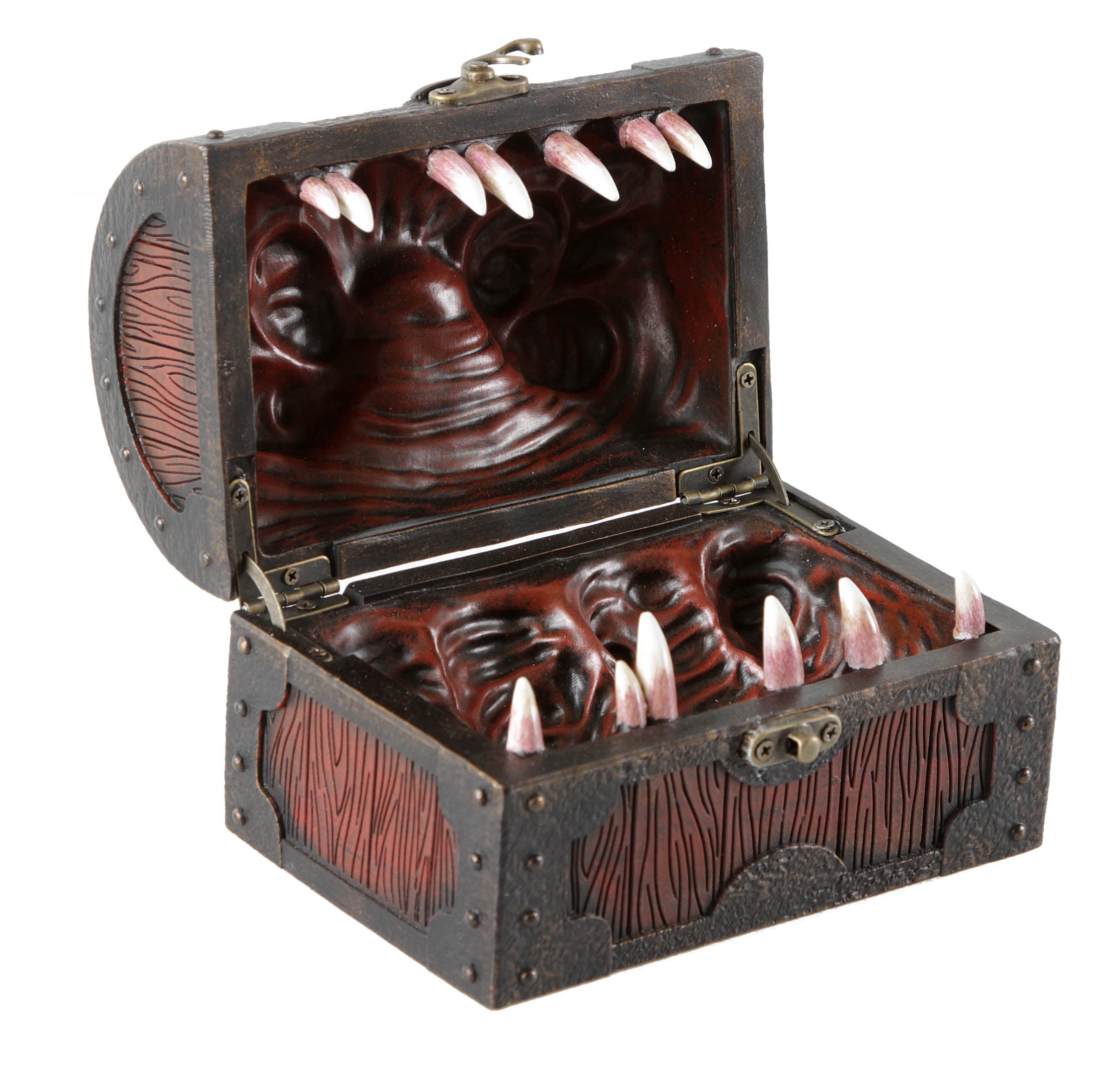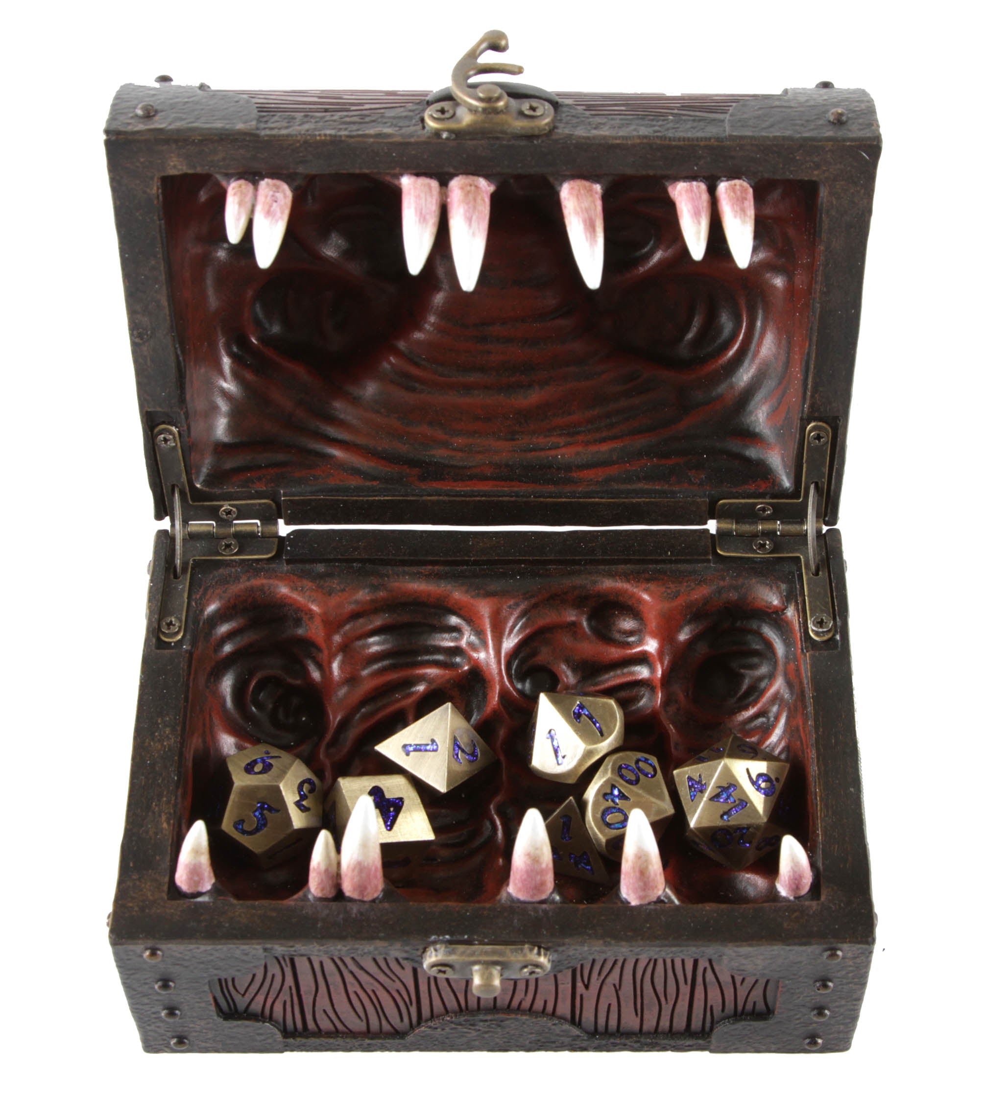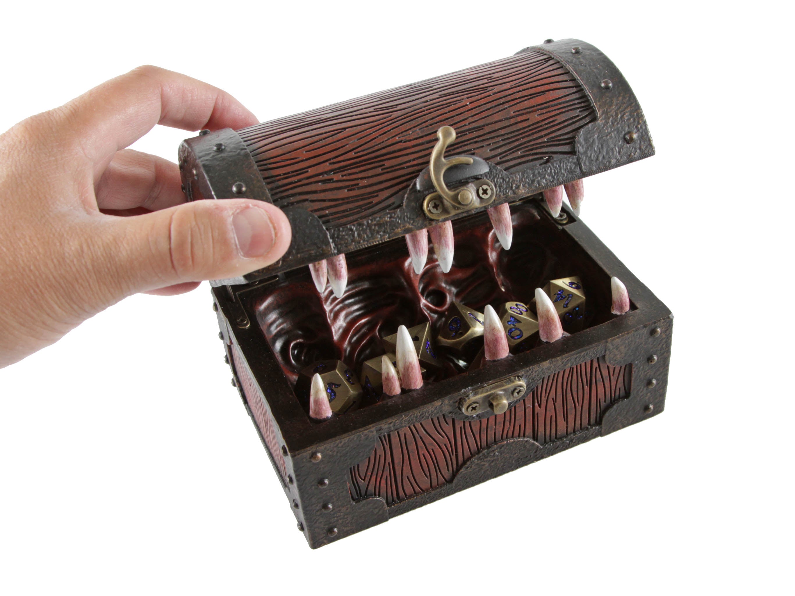 Forged Dice Co. is committed to one thing. Making really, really cool products. Our Mimic Chest box has enough room for 5 sets of polyhedral dice. Don't just show up with a boring bag of devouring or plain old dice bag! Set this inconspicuous treasure chest on the table and stun your gaming friends when they open to reveal the vicious teeth of a MIMIC! Weighing in at 1 pound 8 ounces and made of polyresin this treasure check dice vault is no cheap trinket holder. Hand crafted and hand painted each mimic box is unique and detailed right down to the rivets and teeth. When closed, there is no sign of anything out of the ordinary but when opened the mimic's teeth and bounty are revealed. Dare to remove the precious bounty captured by the Forged Dice Co. Mimic Chest!