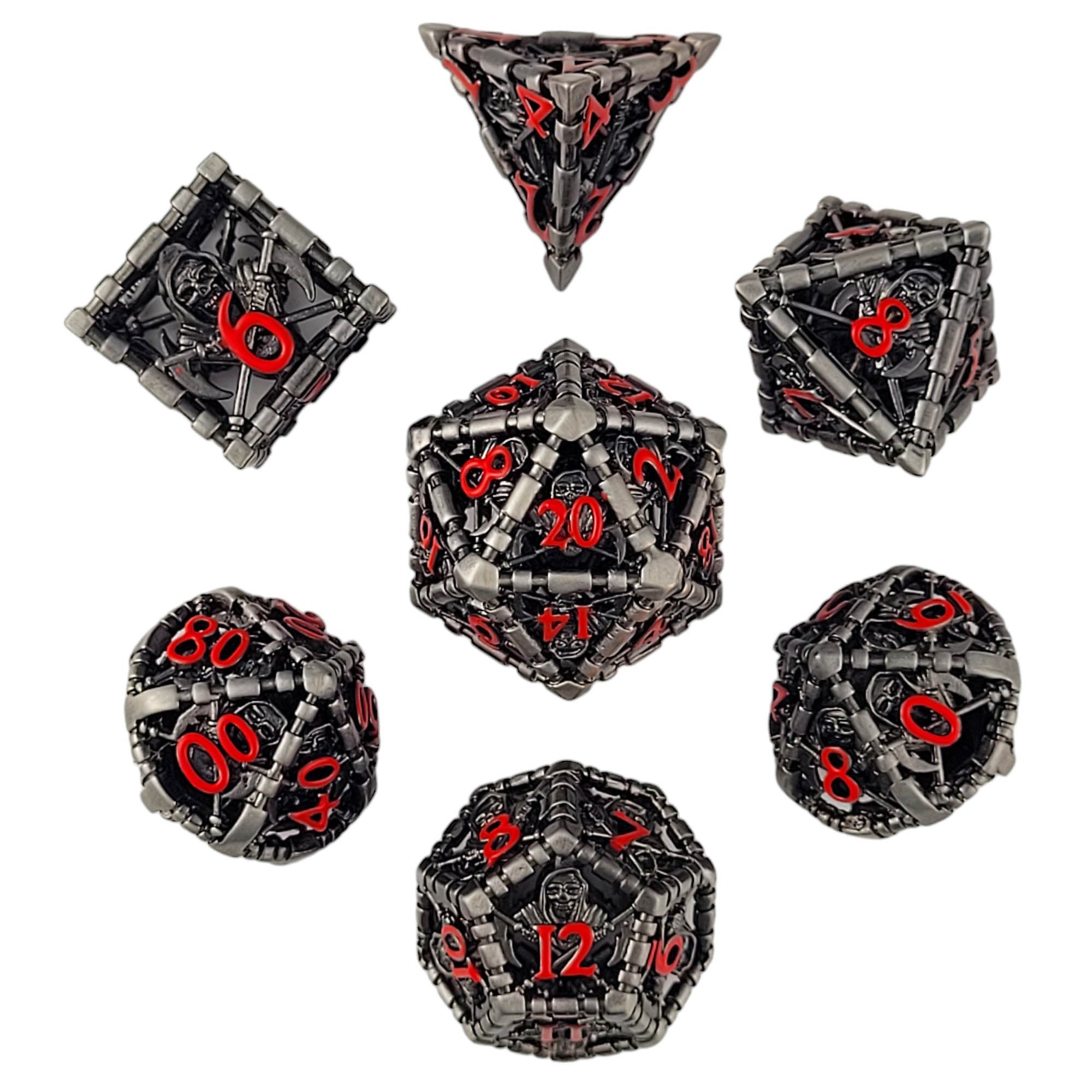 This set is HOLLOW. Each die features a menacing reaper in an nickel finish and red numbers.