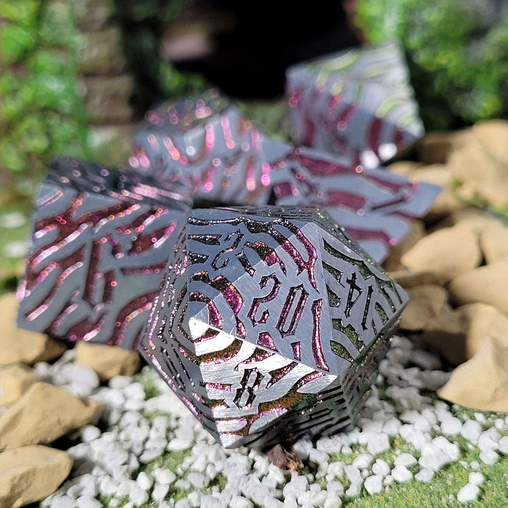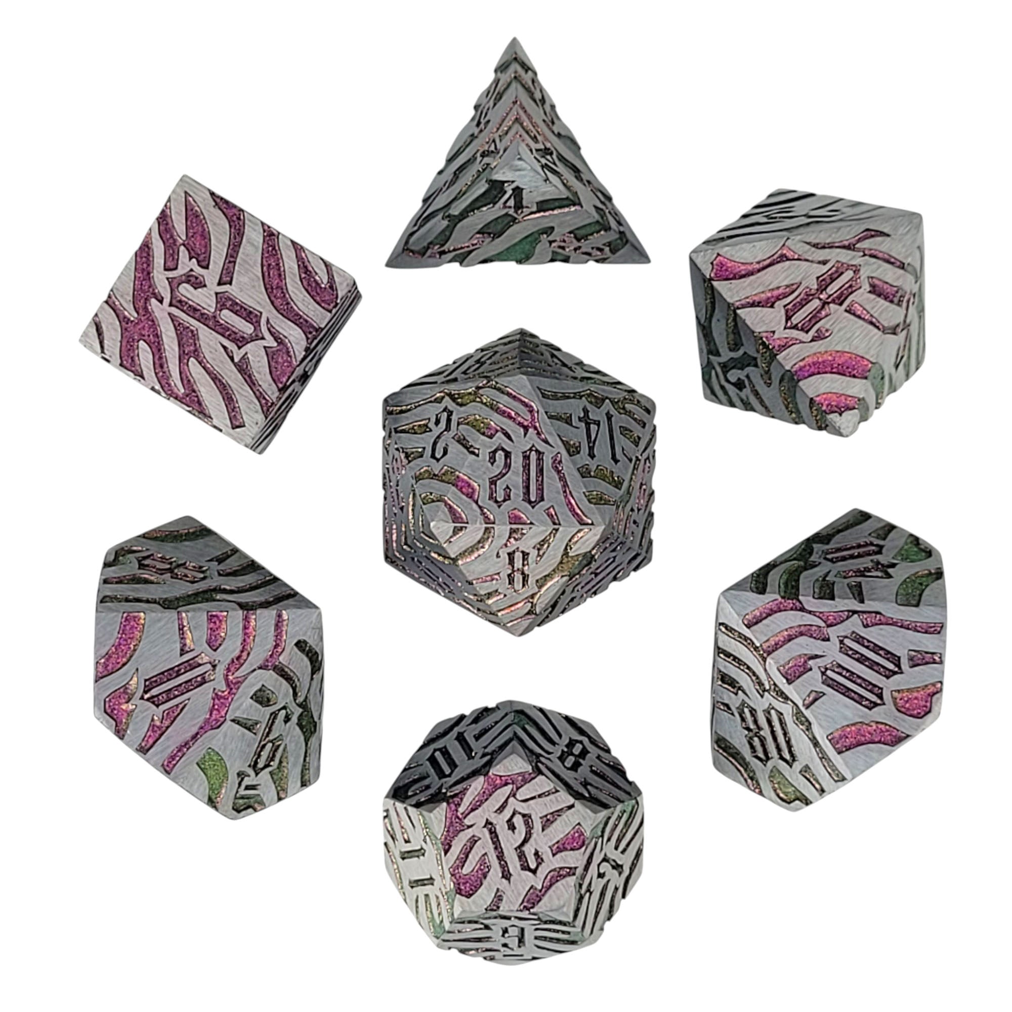 Tiger Stripe Brushed Steel Purple Foil Metal RPG Dice Set of 7