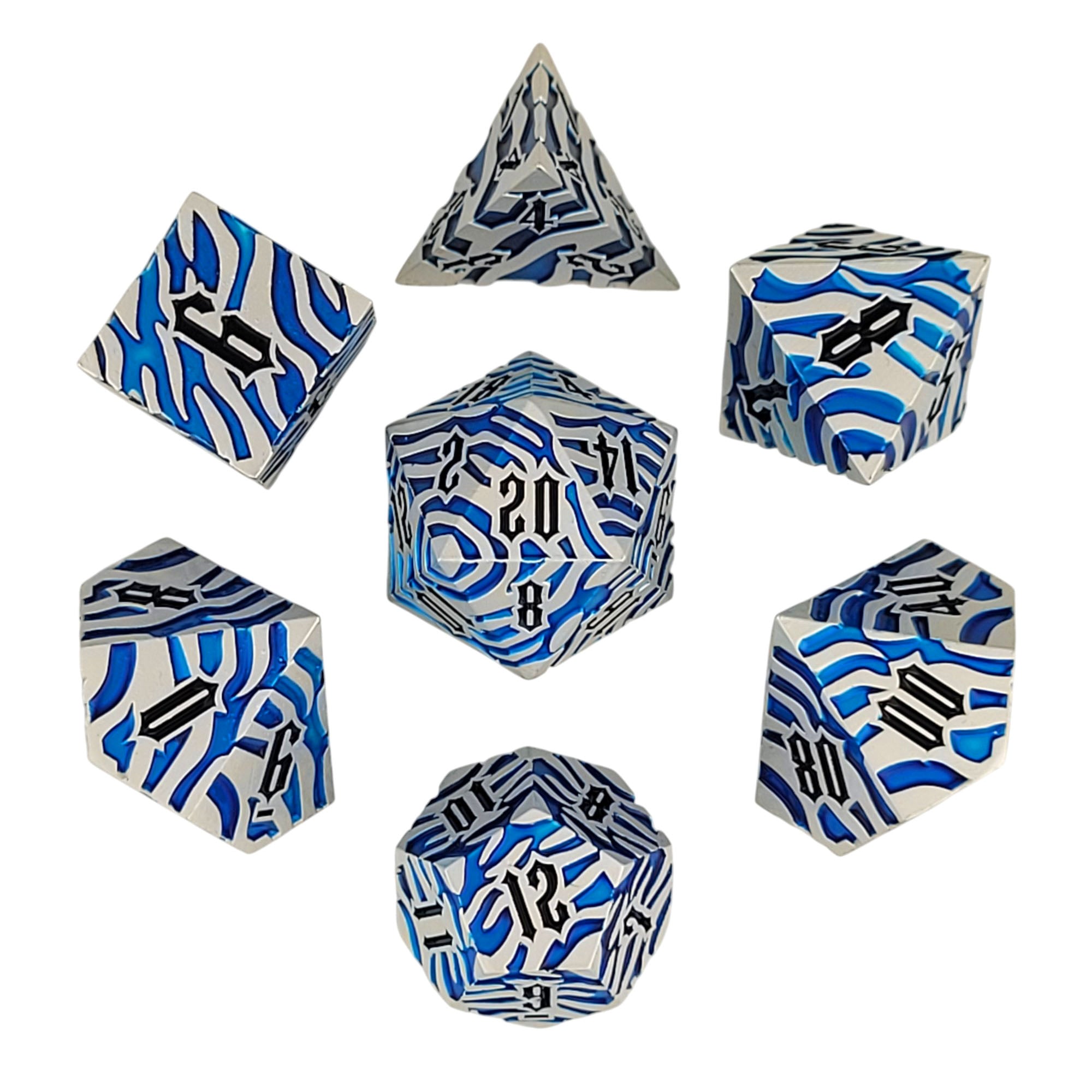 Tiger Stripe Silver Blue Metal RPG Dice Set of 7