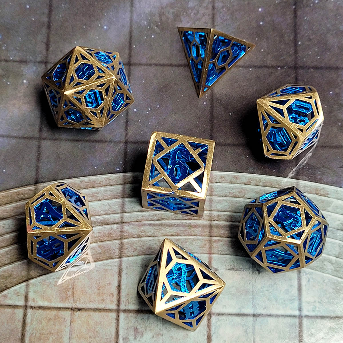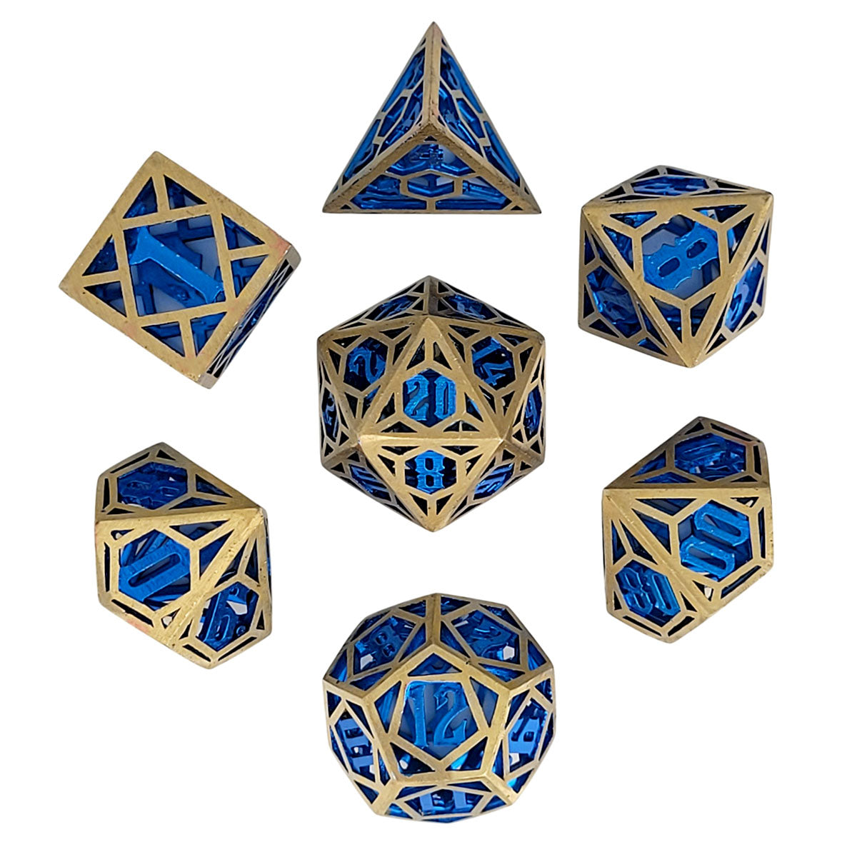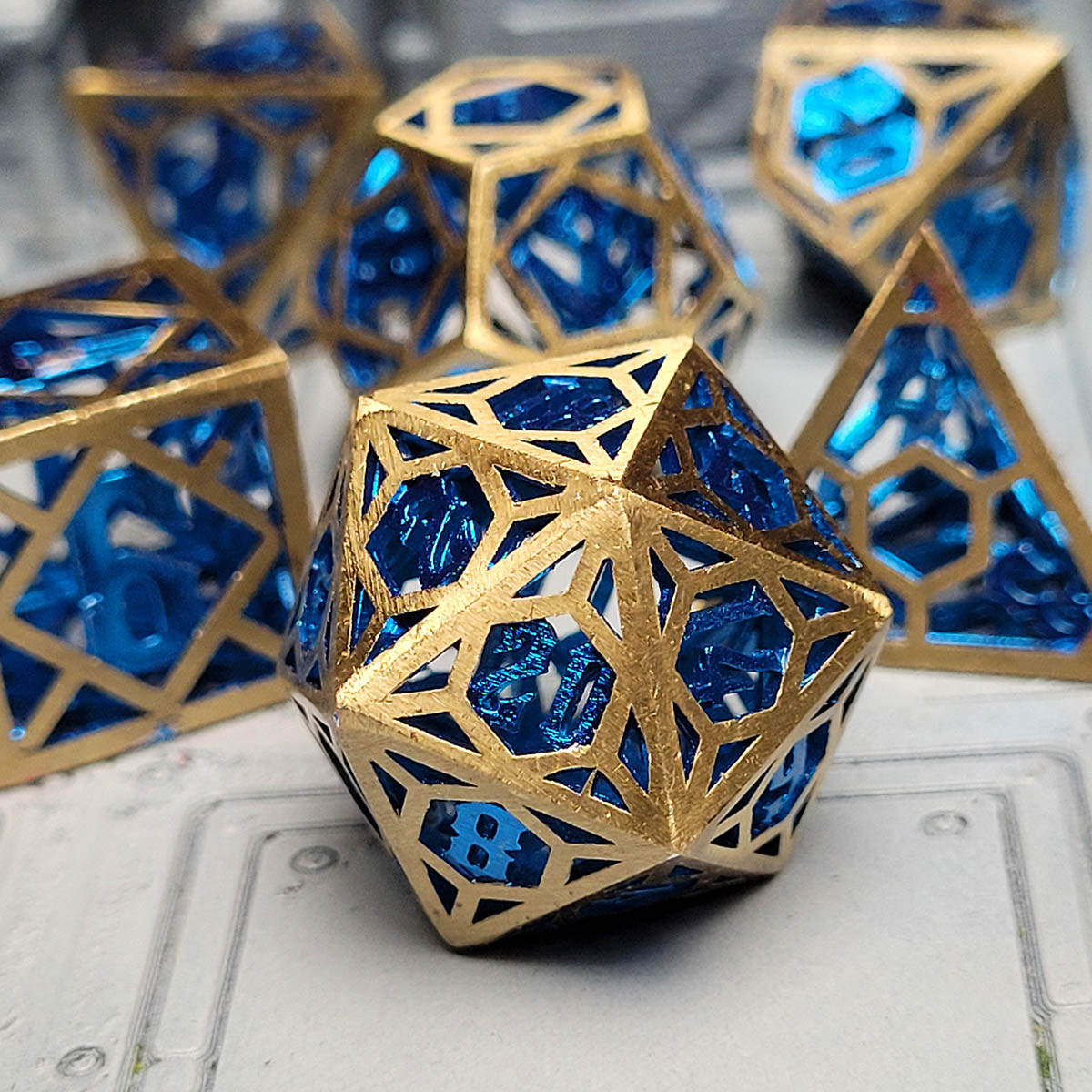 This RPG Dice Set features a geometric patterned hollow metal with a gold finish and blue numbers