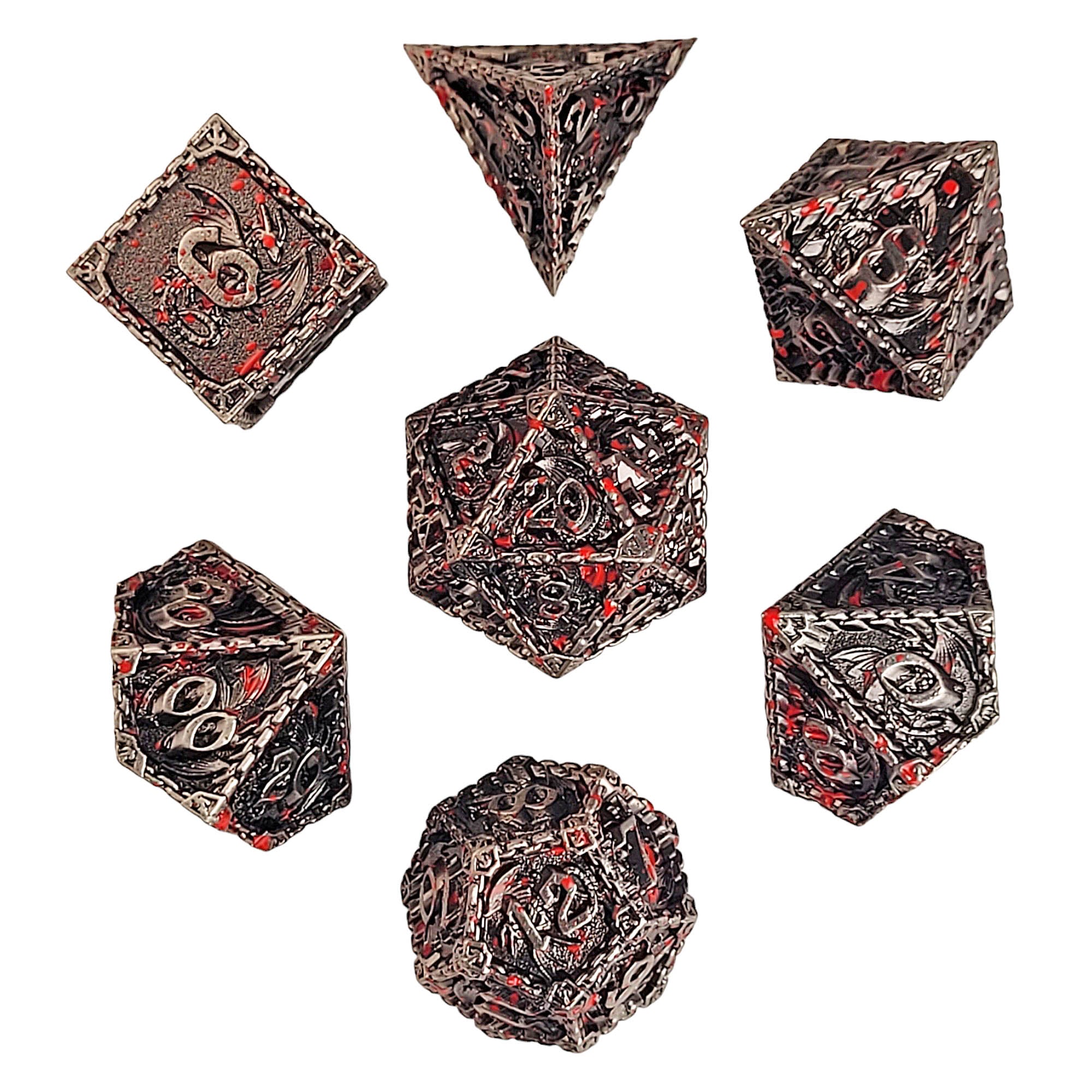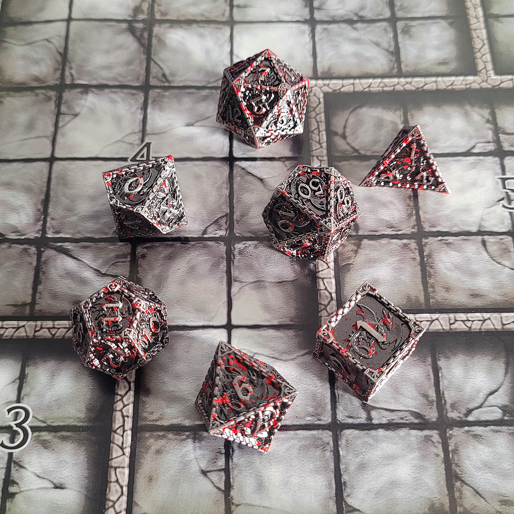 This is brushed silver framing a dark washed finish with blood splatter featuring rampant dragon detail.